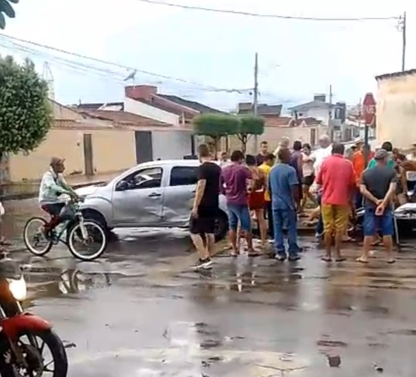 Com o impacto, o Fiat/Mobi rodou na pista e atingiu uma motocicleta Honda/CG que estava parada na rua São Paulo, no sentido contrário ao que o VW/Gol seguia.