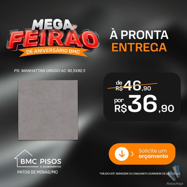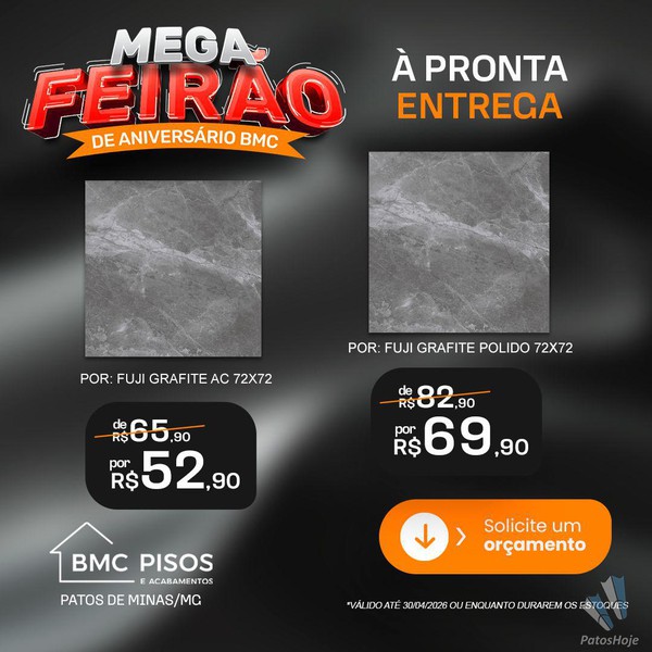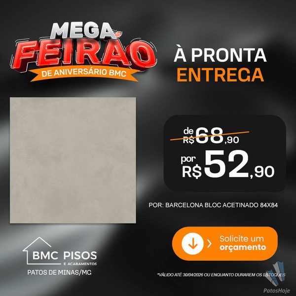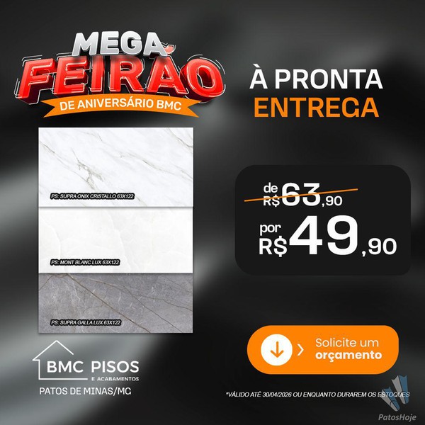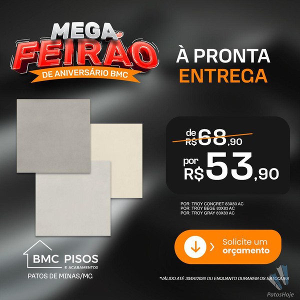 A BMC Pisos e Acabamentos está comemorando um ano em Patos de Minas com a realização do Mega Feirão de Aniversário, reunindo ofertas especiais e condições facilitadas de pagamento. As promoções já estão em vigor e seguem até o dia 20 de abril.