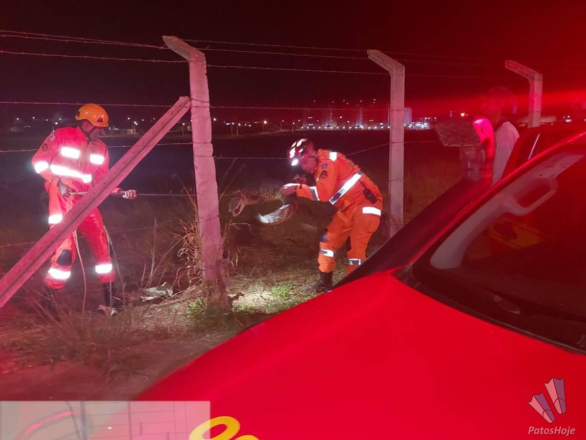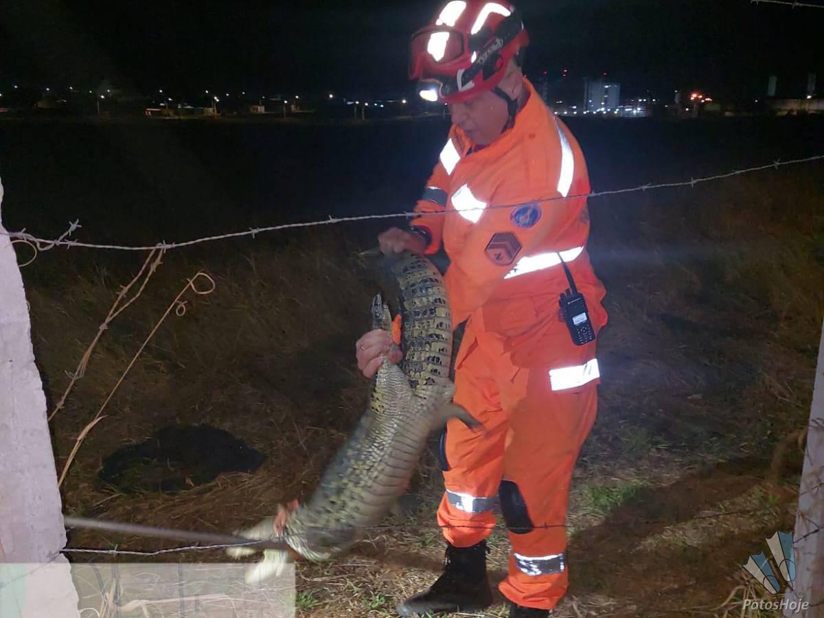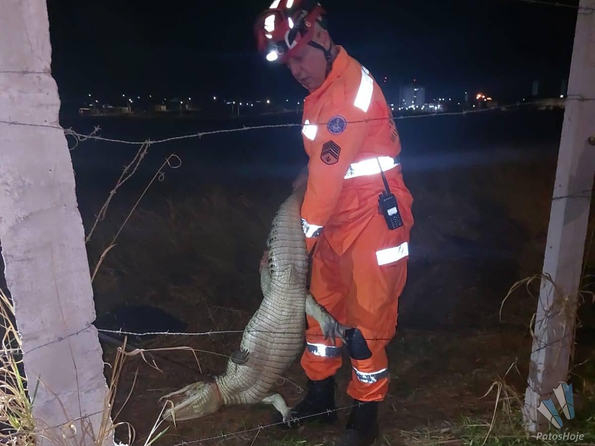 O Corpo de Bombeiros de Patos de Minas foi acionado na noite desta segunda-feira (15) para capturar um jacaré. O animal estava na área seca da lagoa existente no bairro Planalto.
