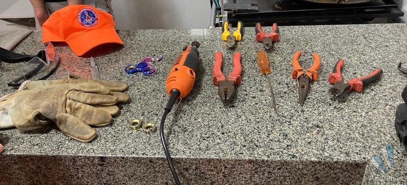 Em segunda tentativa, foi aplicada uma técnica utilizando fio dental mas também não foi suficiente para a remover a anilha. Por fim, foi necessário partir para o uso de ferramentas de corte. Considerando a fragilidade da mão da bebê, a robustez da peça metálica e manuseio de ferramentas de força e de corte, foi necessário um trabalho focado na coordenação motora fina dos envolvidos para evitar acidentes durante o corte.