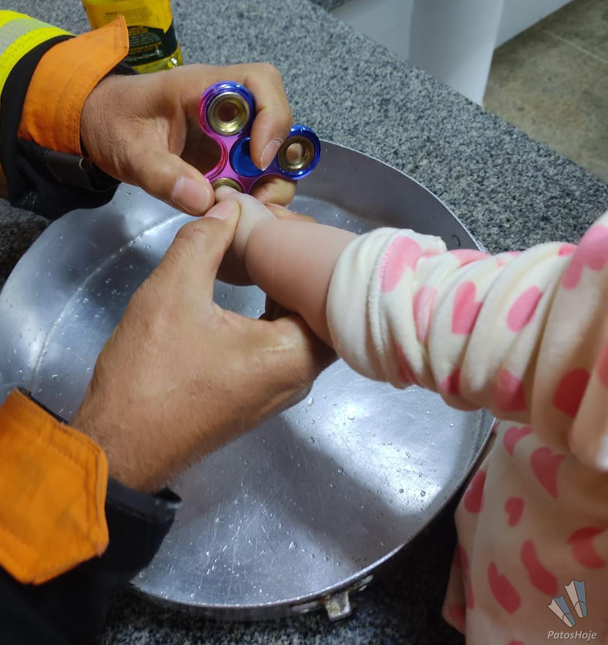 Segundo a mãe, antes de procurar o Corpo de Bombeiros, ela tinha tentado retirar o brinquedo do dedo da bebezinha usando água e sabão porém não obteve êxito. Após avaliação, a primeira providência dos Bombeiros Militares foi tentar a remoção usando óleo de cozinha, porém não foi efetiva.