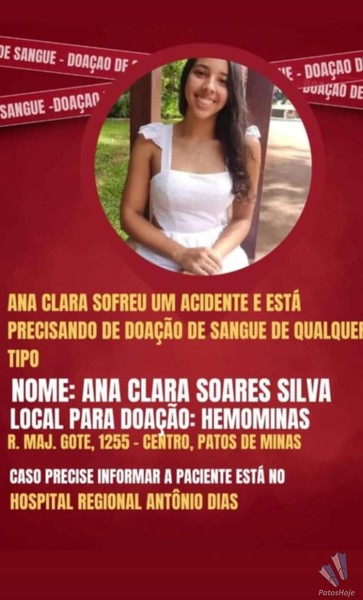 A condutora do Fiat/Palio, Ana Clara Soares Silva, está precisando de doação de sangue. Ela continua internada em estado grave no Hospital Regional. Familiares e amigos estão fazendo uma campanha para que doadores façam a doação de qualquer tipo de sangue no Hemominas, na Rua Major Gote, ao lado do Hospital Regional.