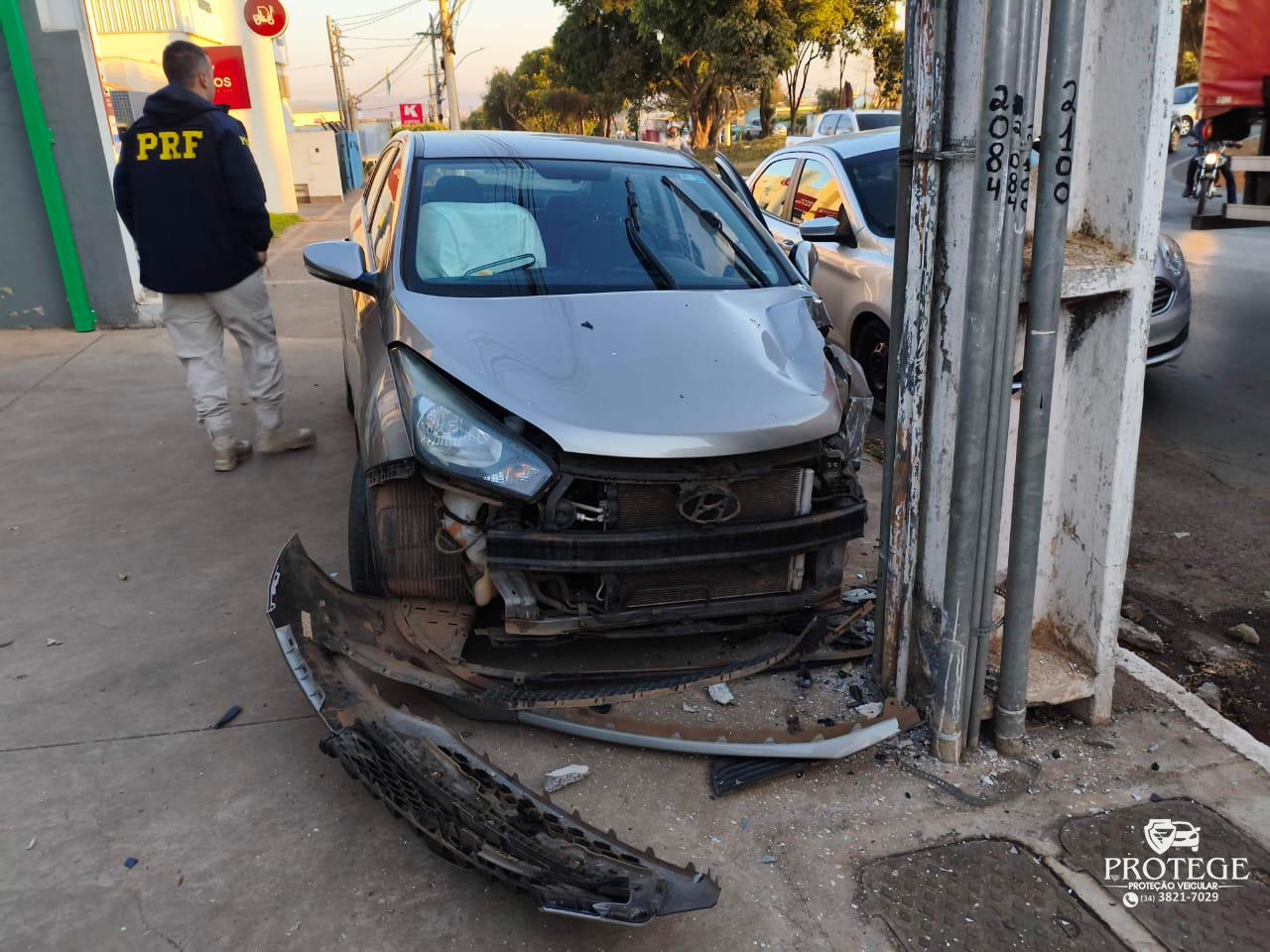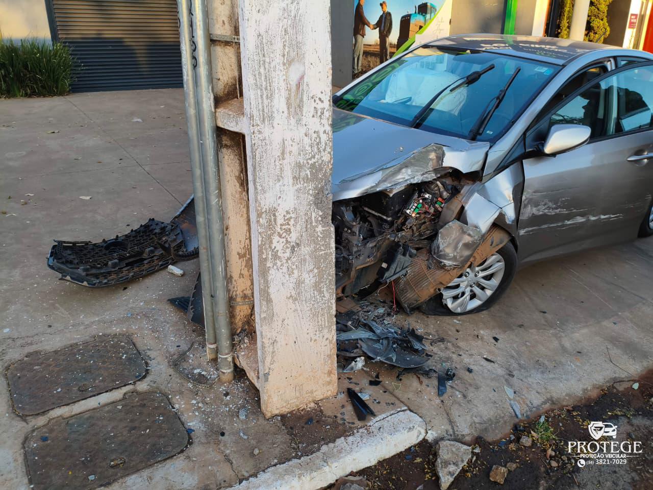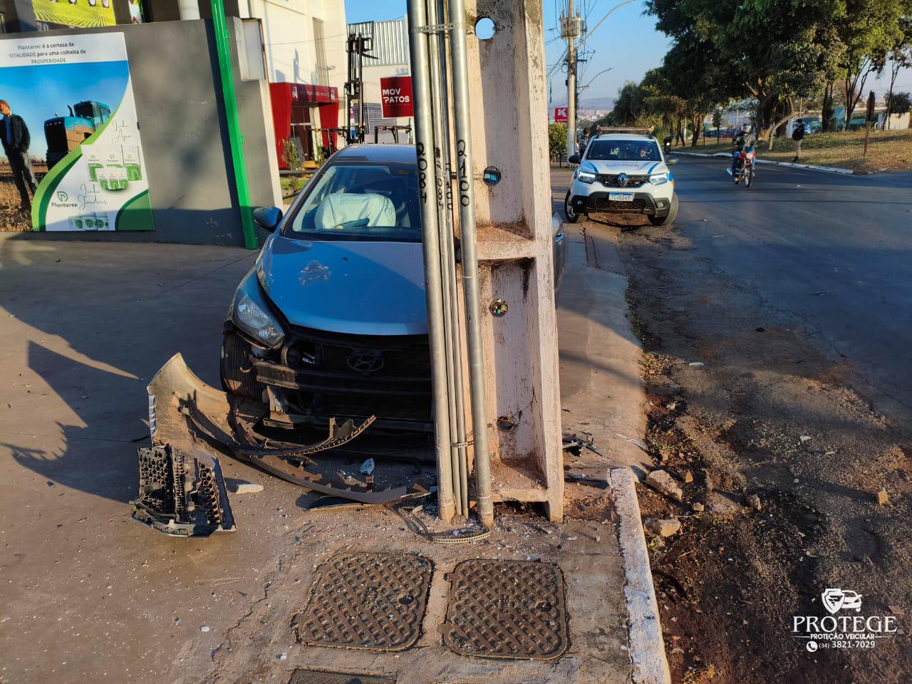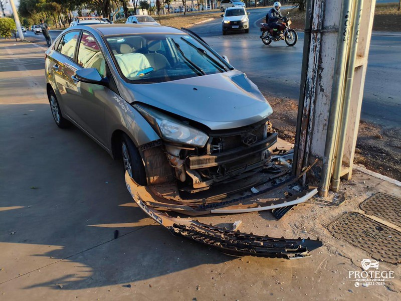 Uma câmera de segurança instalada na avenida JK registrou o momento em que o motorista de um VW Gol, modelo antigo, acessa de uma vez a pista da marginal sem observar o fluxo. A condutora do veículo que seguia pela via tentou desviar e acabou batendo violentamente contra o poste de iluminação.