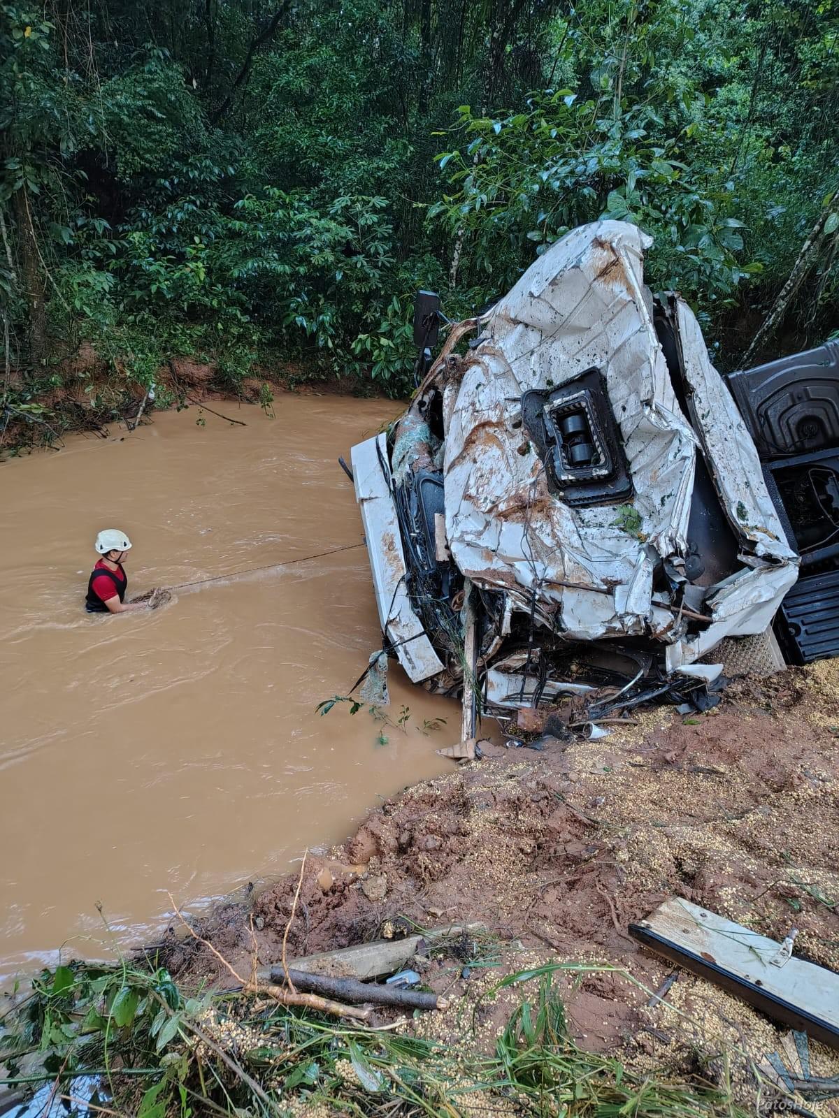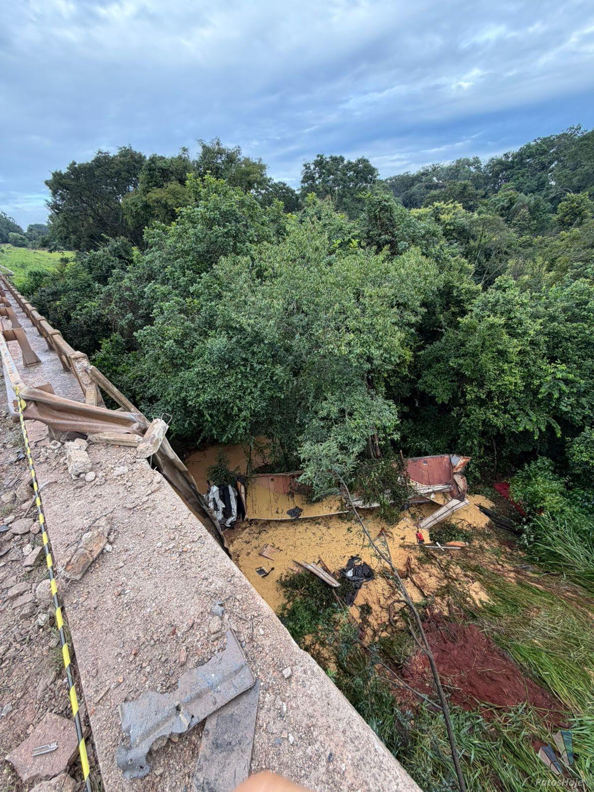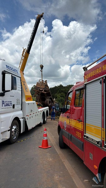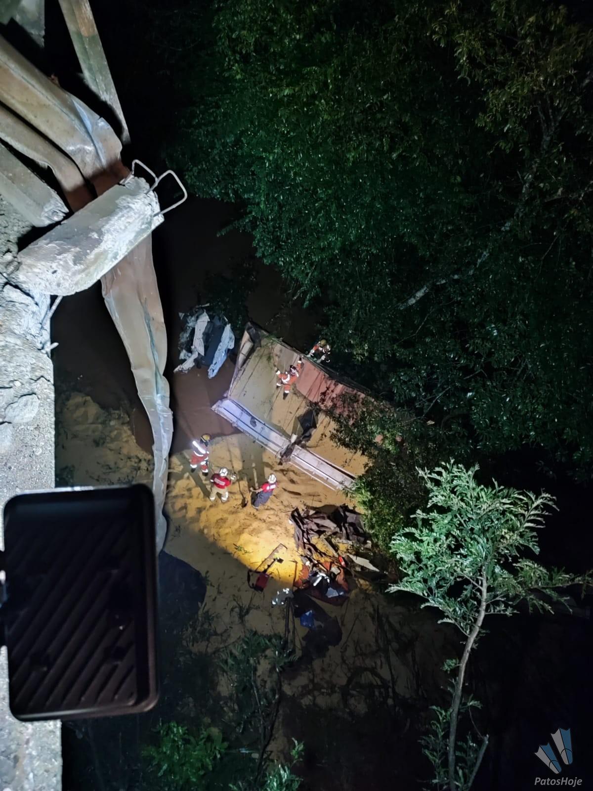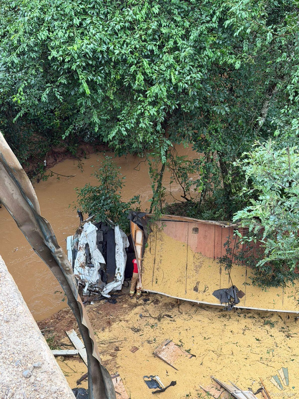 O grave acidente aconteceu na noite dessa terça-feira (03) na BR 365, dois quilômetros depois do trevo com a BR 146, em Patos de Minas. Uma carreta carregada com soja caiu da ponte. O motorista ainda não foi encontrado. Os bombeiros trabalham para retirar a carga manualmente para tentar encontrar o condutor.