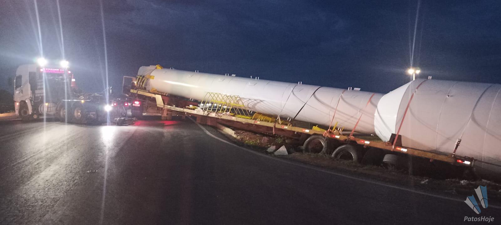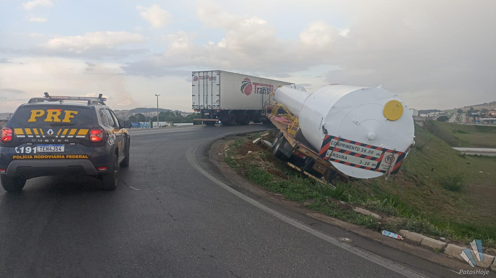 Mais um acidente envolvendo veículo de carga nas rodovias da região. No final da tarde desta quinta-feira (16), uma carreta que transportava uma caixa d’água enorme foi parar fora da pista quando fazia a alça do viaduto no Trevo da Pipoca, em Patos de Minas. A pista teve que ser interditada.