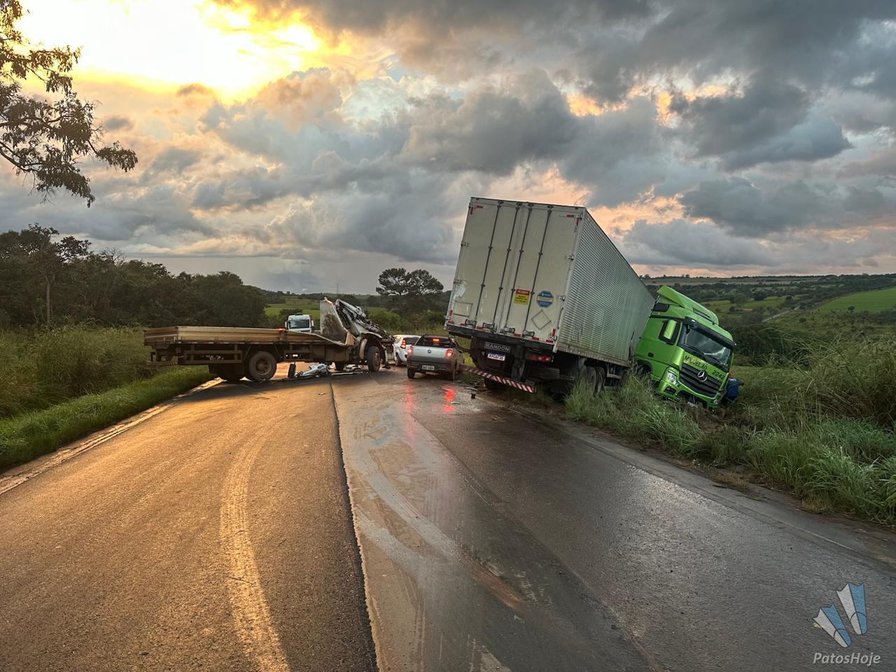 Uma carreta saiu da pista e foi atingida, na traseira, por um caminhão, no km146, da MGC354, em Presidente Olegário, na tarde dessa terça-feira (29). A rodovia estava molhada, o que teria contribuído para o acidente. Não houve feridos, apenas danos materiais.