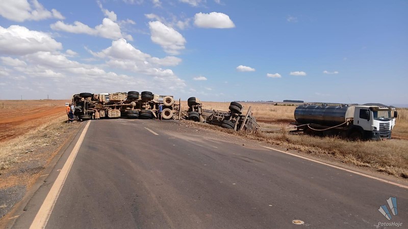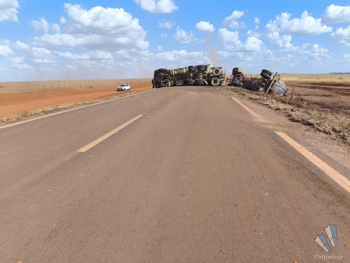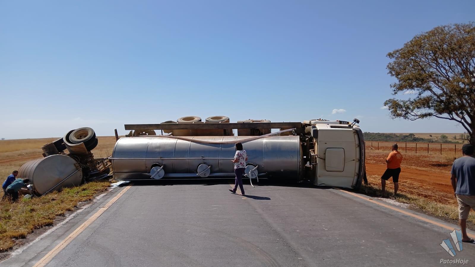 Uma carreta tanque que transportava leite tombou na MG 410 e parou atravessa na pista, bloqueando completamente a rodovia. O acidente aconteceu no início da tarde desta quinta-feira (07) e não deixou feridos. A pista foi liberada por tá das 17h.