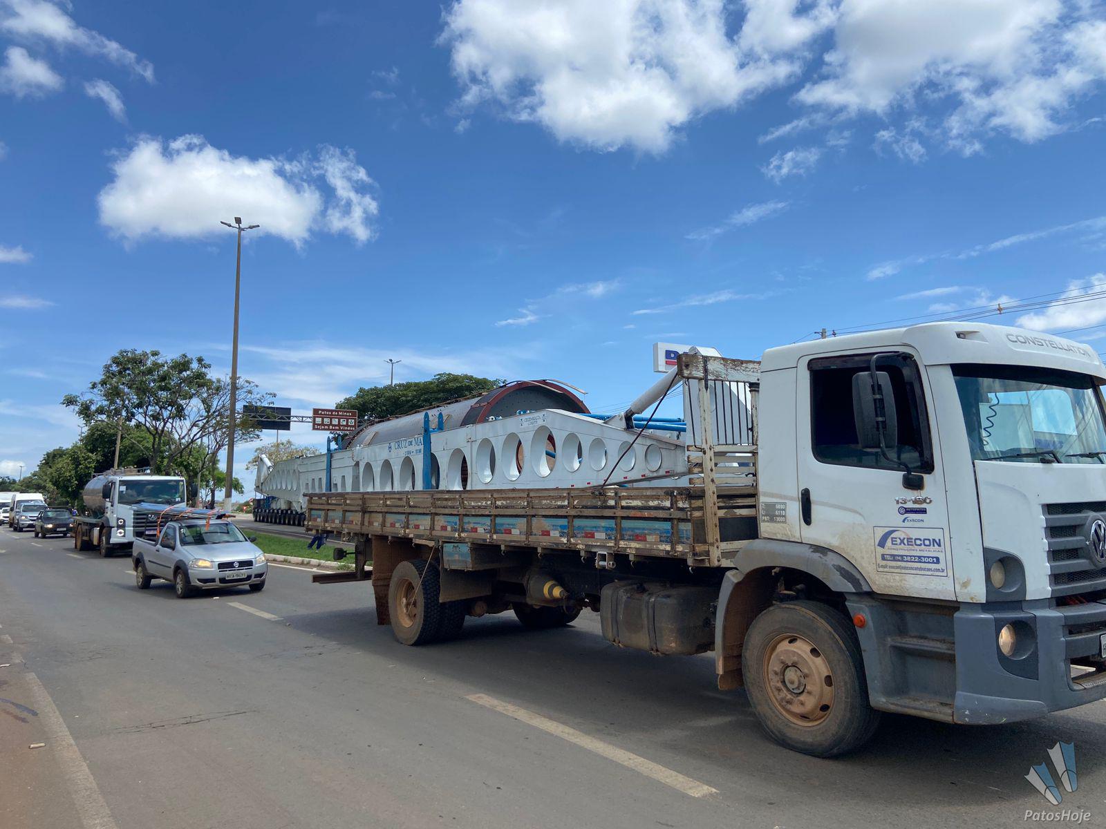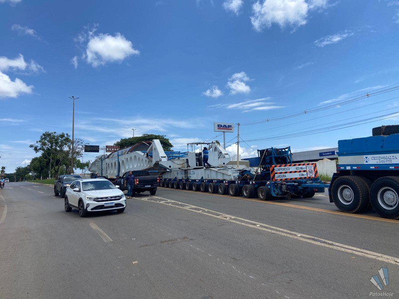 O comboio que transporta um sistema de moagem de quase 640 toneladas passou pelo Trevo da Pipoca, entroncamento da BR352 com a BR365, em Patos de Minas, na manhã desta terça-feira (02). A cena atraiu várias pessoas que acompanharam a manobra no viaduto. A carga está sendo transportada para a cidade de Edealina, município do Goiás.