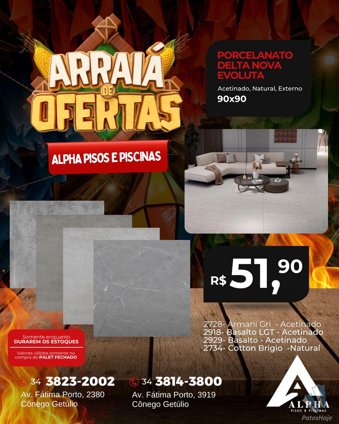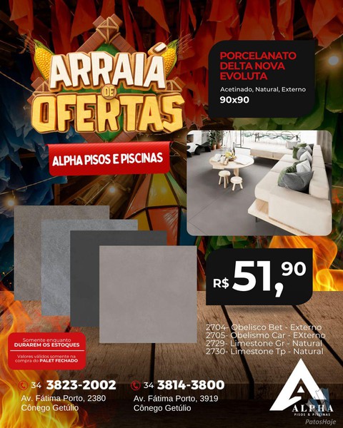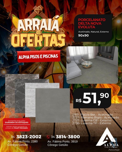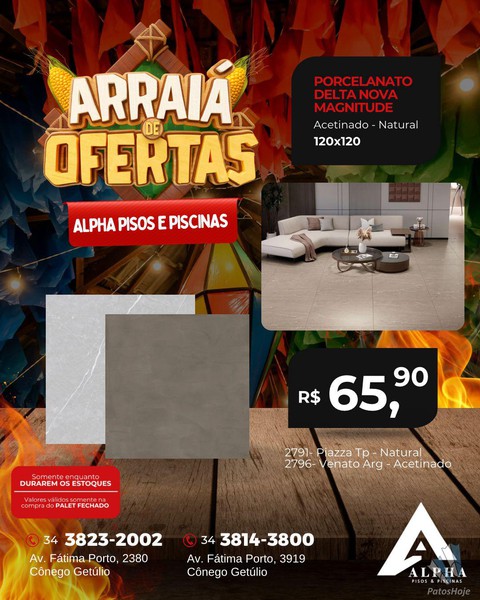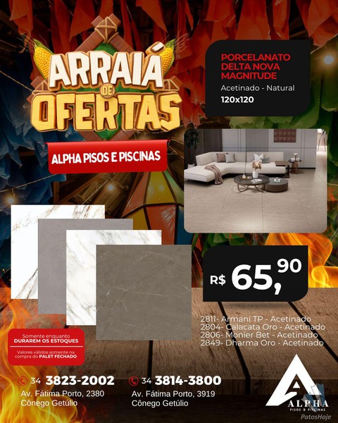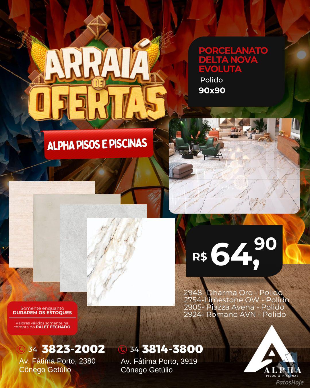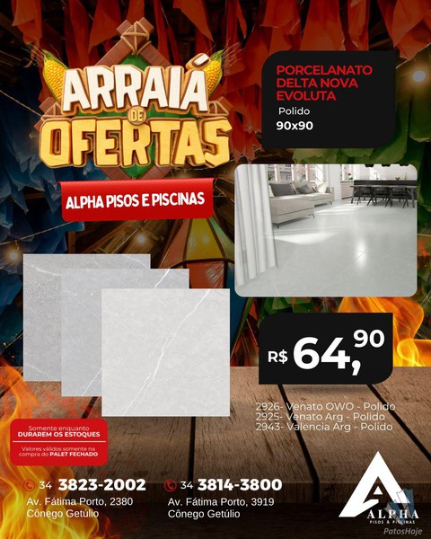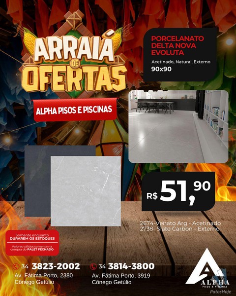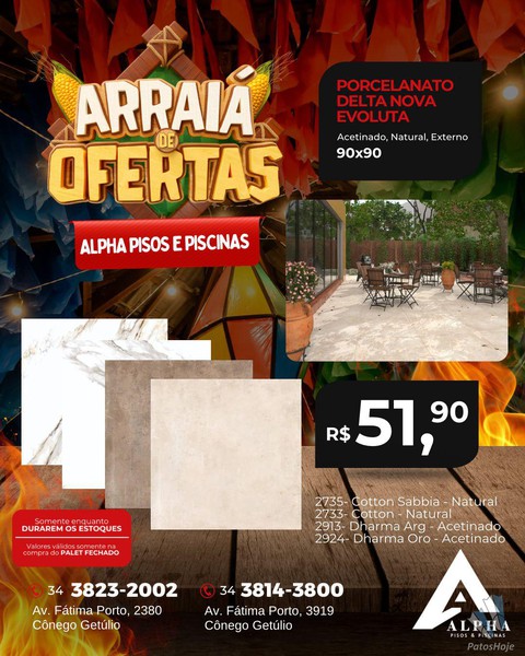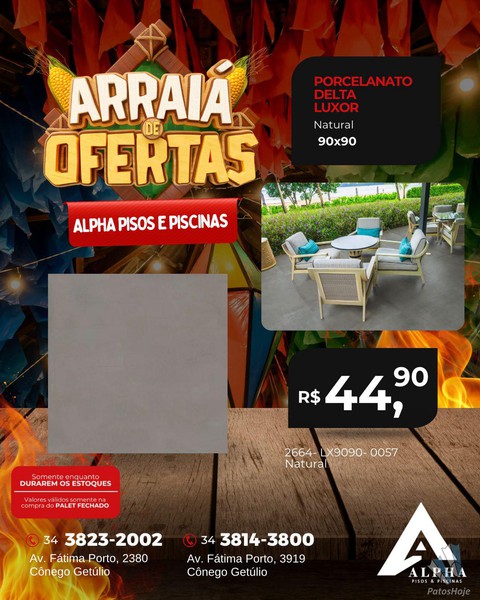 Venha conferir o Arraiá de Ofertas da Alpha Pisos & Piscinas. São duas lojas em Patos de Minas: