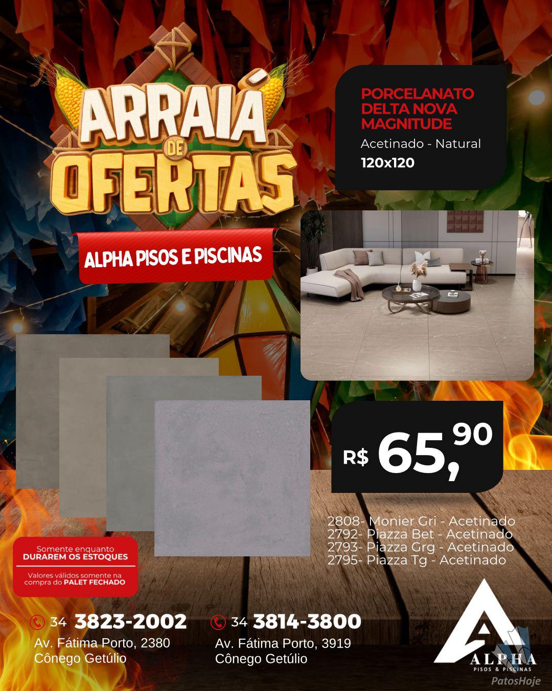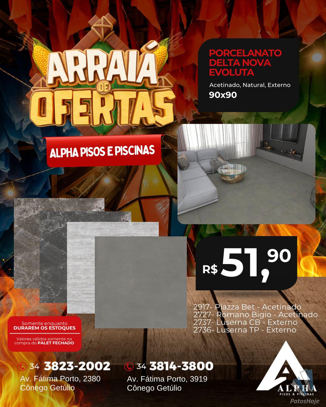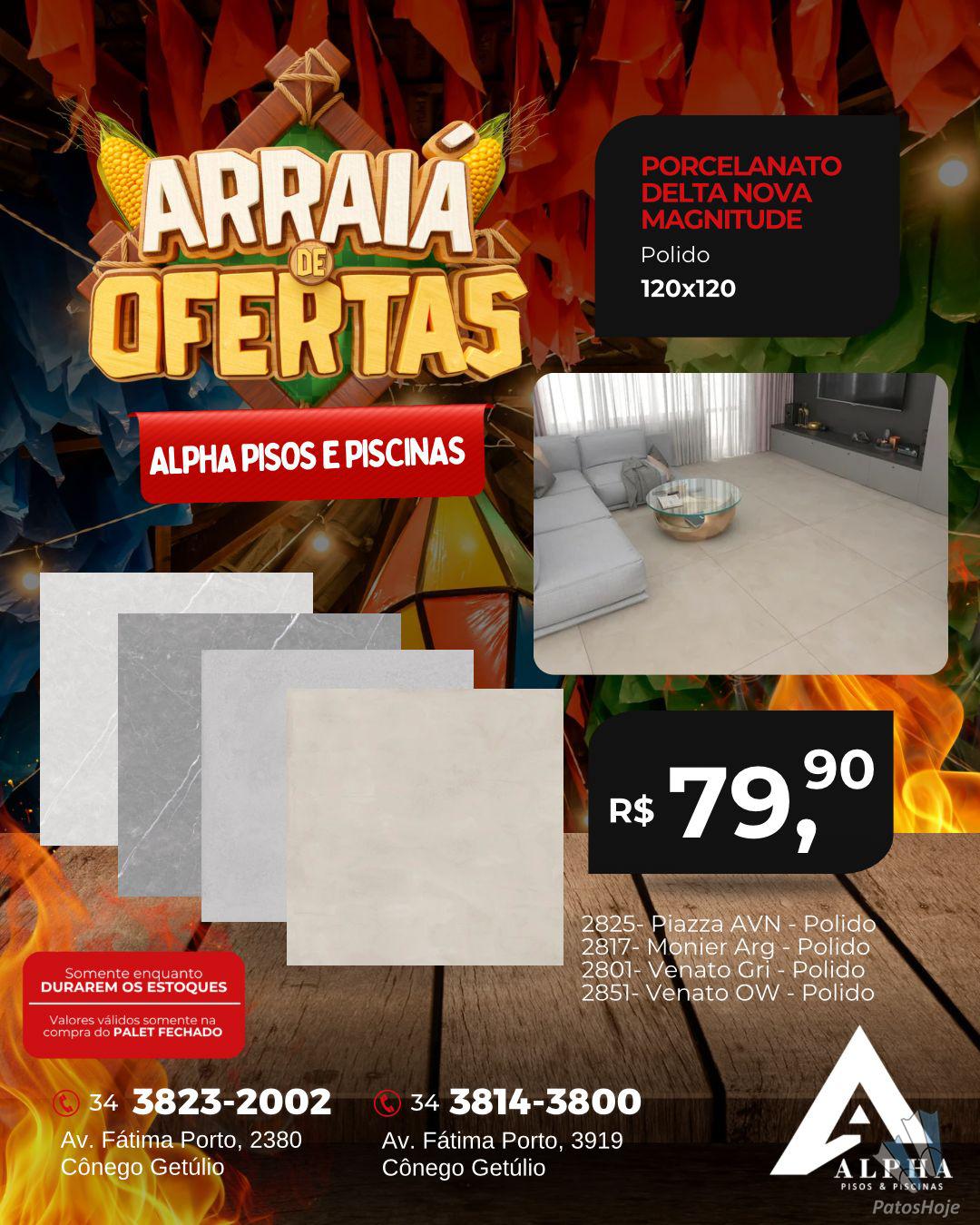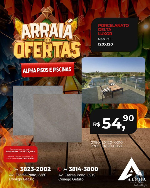 Venha conferir o Arraiá de Ofertas da Alpha Pisos & Piscinas. São duas lojas em Patos de Minas: