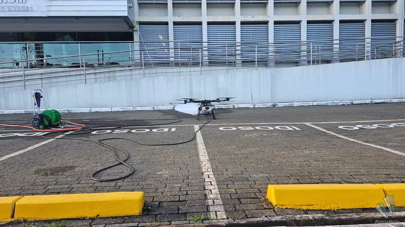 O equipamento utilizado é um drone agrícola de grande porte, operado por uma empresa especializada de São Paulo. Adaptado para esse tipo de serviço, o drone conta com um sistema de pulverização capaz de aplicar produtos de limpeza diretamente na superfície. A substância atua na remoção da sujeira acumulada e, na sequência, um jato de água limpa finaliza o trabalho, deixando a estrutura renovada.
