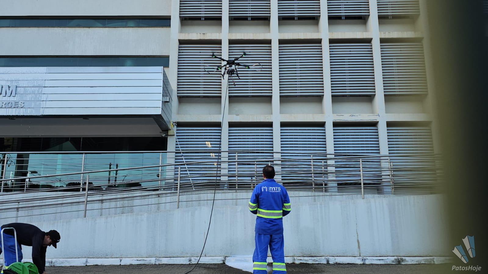 Quem passou pela rotatória da avenida Padre Almir com a avenida Angra dos Reis na tarde desse domingo (12) foi surpreendido pela tecnologia usada por uma empresa para fazer a limpeza do Fórum de Patos de Minas. Um drone de grande porte foi utilizado para lavar a fachada do prédio, em um trabalho que impressionou pela eficiência e modernidade.
