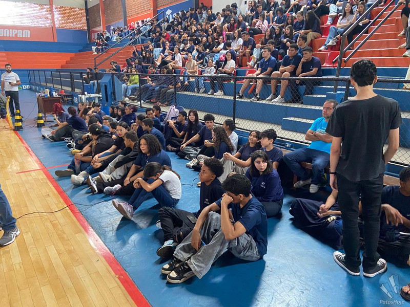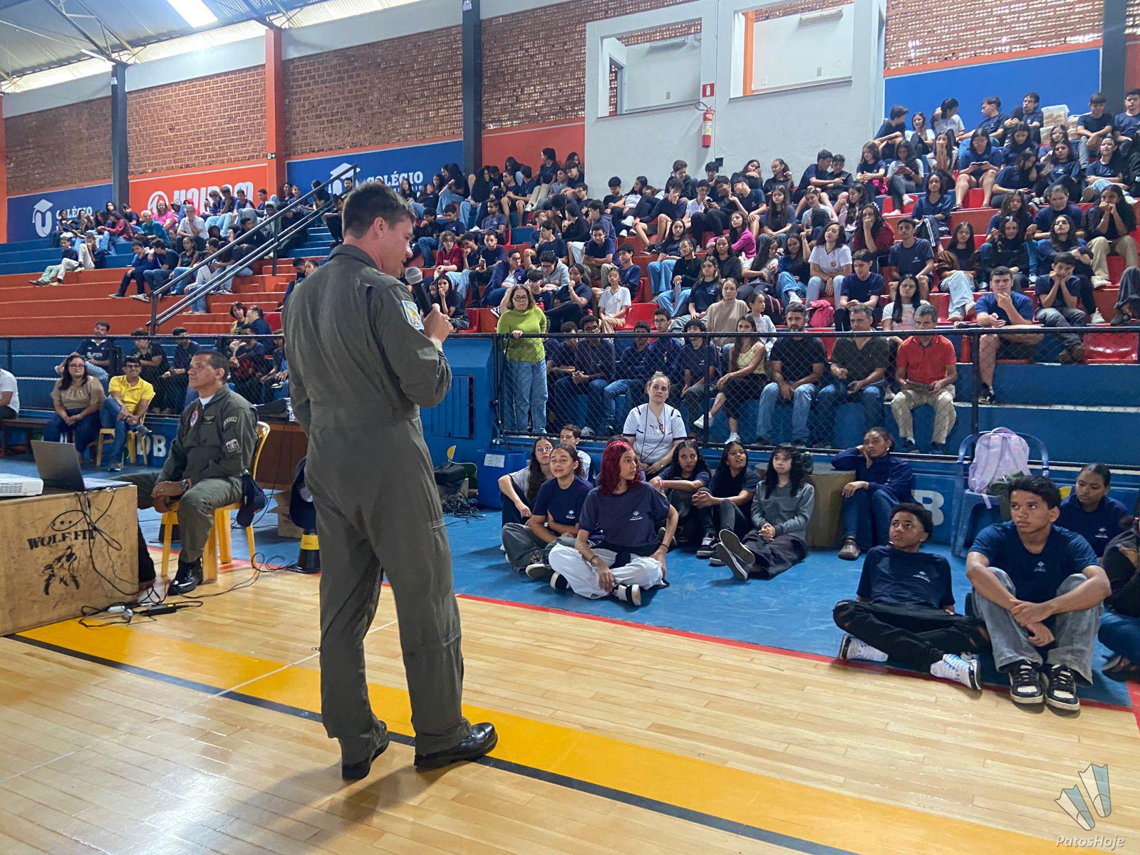 Militares Esquadrilha da Fumaça, da Força Aérea Brasileira (FAB), realizaram, na manhã desta quinta-feira (26), uma palestra para alunos do 9° ano da rede municipal de ensino de Patos de Minas. O encontro aconteceu no Ginásio do PTC, no Centro da cidade. O objetivo foi mostrar para os alunos como é a atuação da FAB.