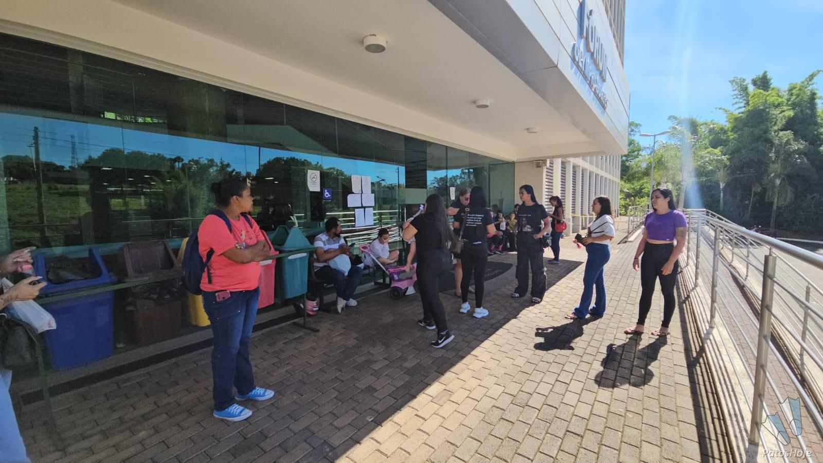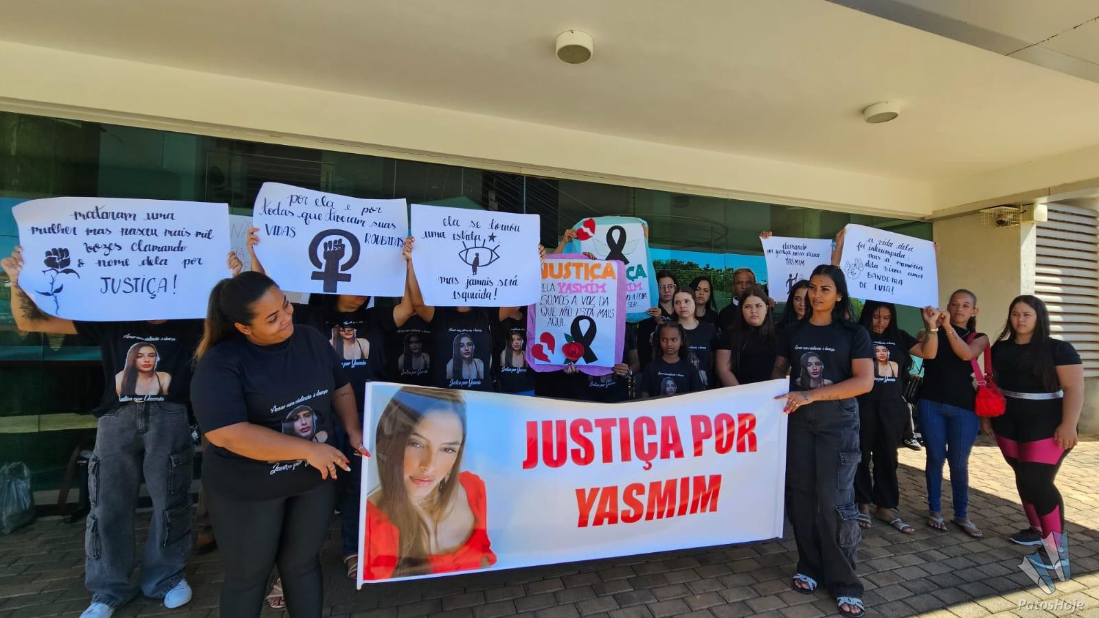 Familiares e amigos de Yasmin Araújo Castro e Silva, de 23 anos, realizam uma manifestação na porta do Fórum Olympio Borges, em Patos de Minas, na manhã desta quarta-feira (19). Com faixas, cartazes e camisetas personalizadas, eles pedem Justiça no julgamento de Mauro Vinícius Expedito Silva, de 25 anos, acusado de matar a jovem a tiros na frente da filha do casal. O réu será julgado hoje em júri popular.