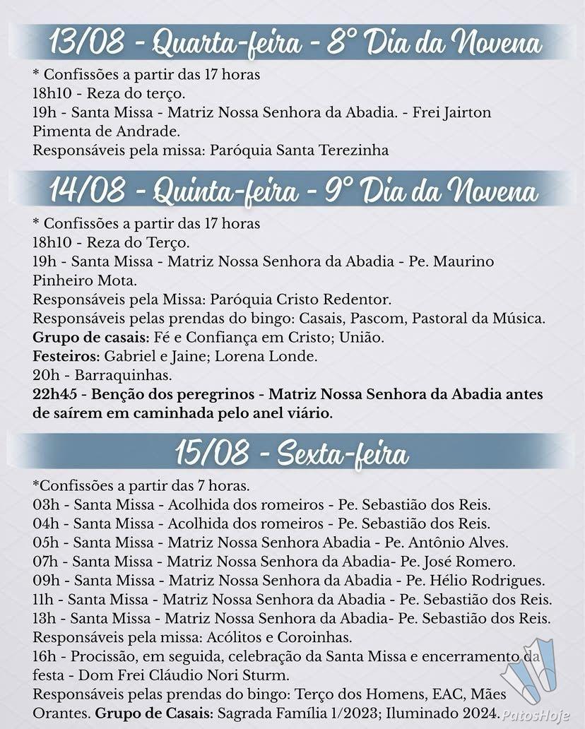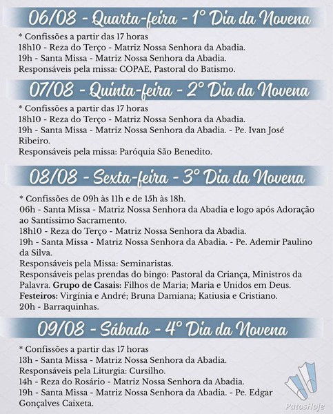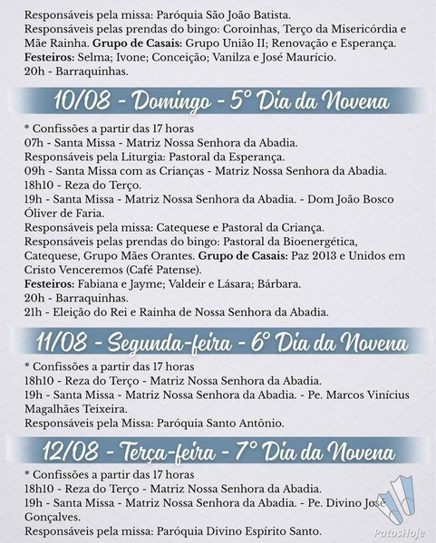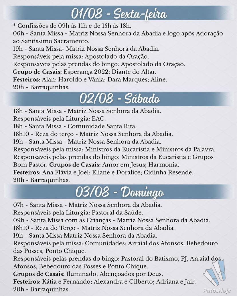 Agosto começa amanhã e muitas pessoas associação esse mês a Nossa Senhora Da Abadia, co-padroeira da Diocese de Patos de Minas. Existe uma grande devoção pela santa em toda a região. Em Patos de Minas, a festa em honra a Nossa Senhora da Abadia já começou e a programação prevê celebrações e movimentações de barraquinhas. A renda será revestida para continuidade da construção da nova matriz.