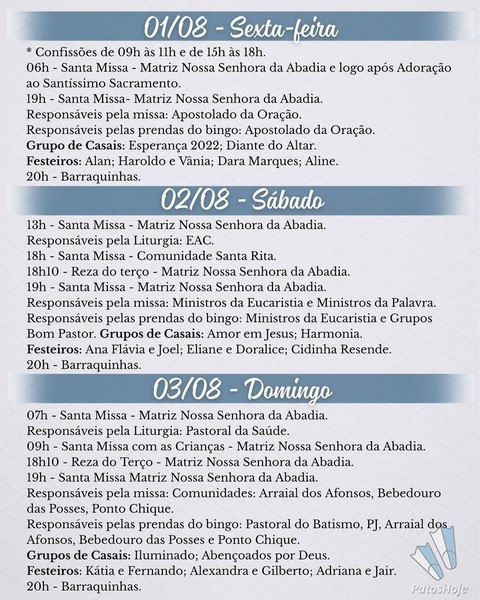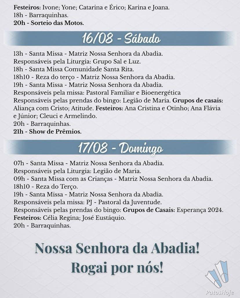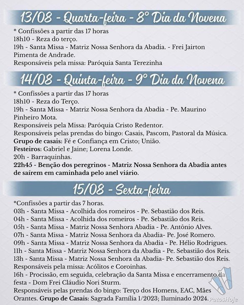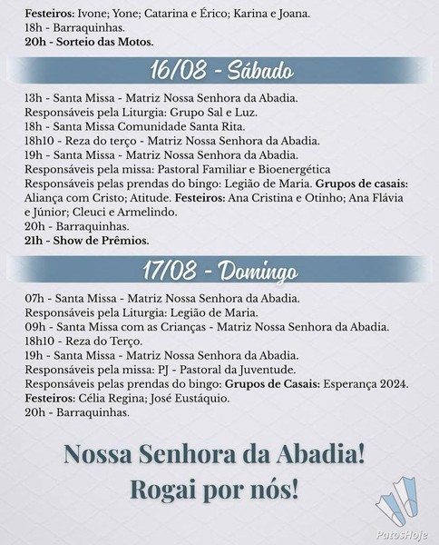 O padre Sebastião Reis fez o convite para a celebração da festa de Nossa Senhora da Abadia. A programação está anexada logo abaixo.