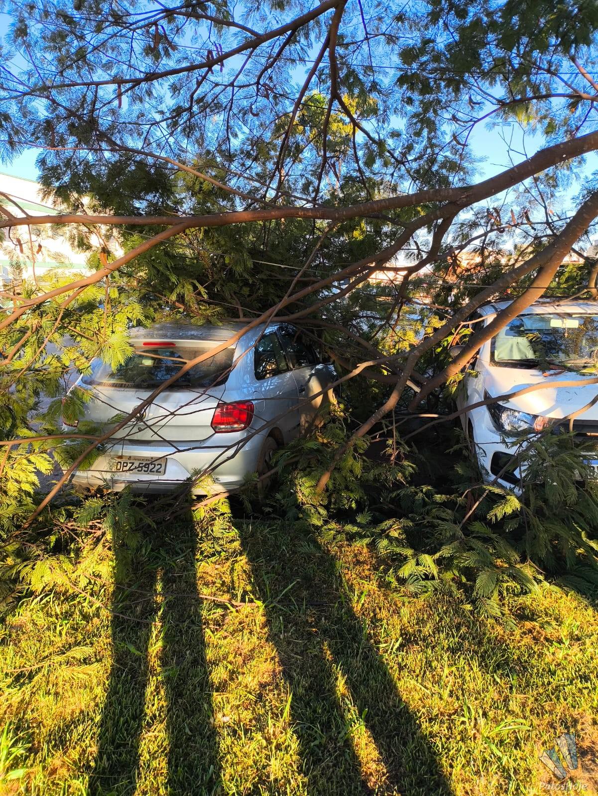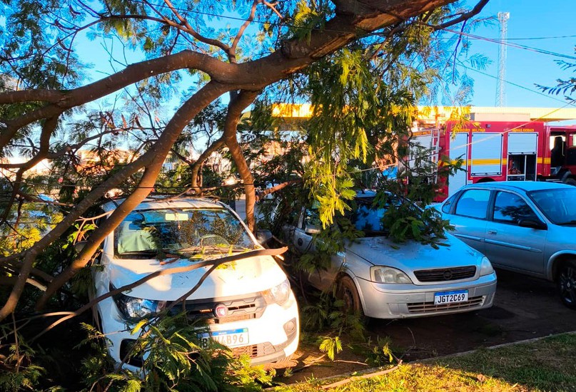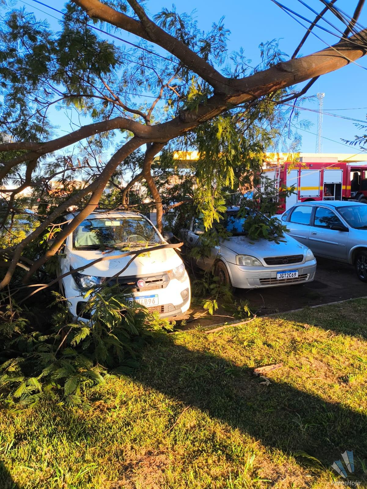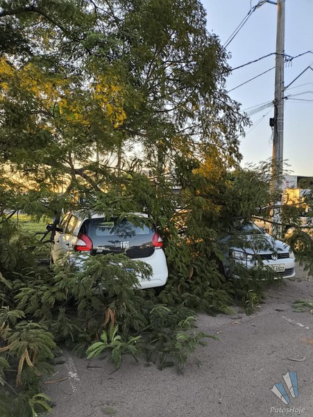 Partes de uma grande árvore caíram na manhã desta segunda-feira (19) e atingiram carros e a rede elétrica da Ceasa de Patos de Minas. O Corpo de Bombeiros precisou ser acionado para remover os galhos que causaram estragos.