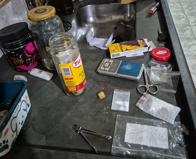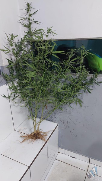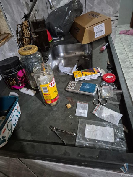 No interior da residência, que já vinha sendo alvo de denúncias de tráfico de drogas, os policiais encontraram pedras de crack, porções de um pó branco semelhante a cocaína, balança de precisão e, no corredor do lado de fora, um grande pé de maconha.