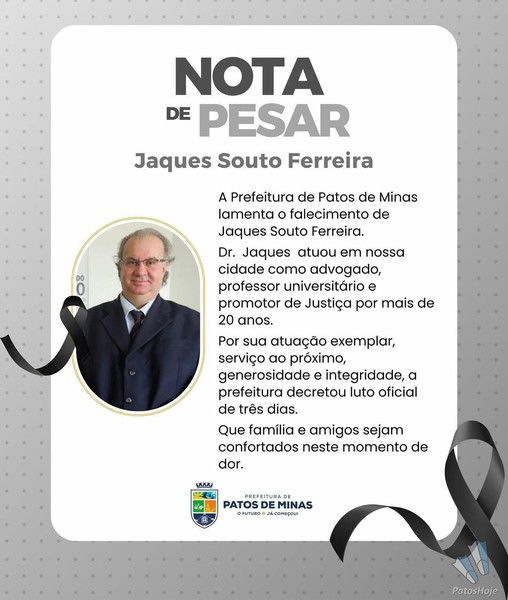 Por meio de nota, a Prefeitura de Patos de Minas lamentou o falecimento do Jaques e destacou que ele teve uma “atuação exemplar, serviço ao próximo, generosidade e integridade”. Devido ao falecimento, o Executivo Municipal decretou luto oficial de três dias.
