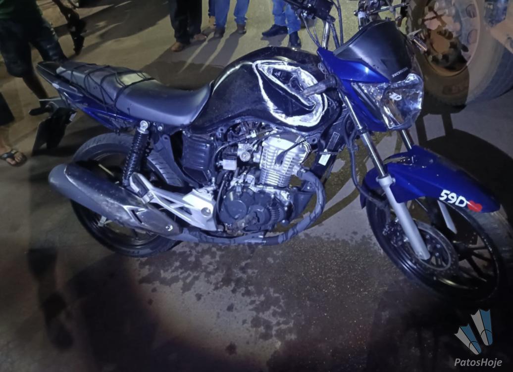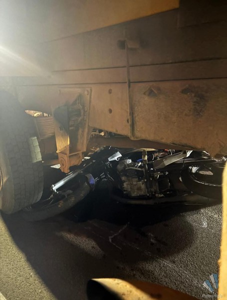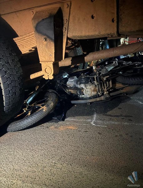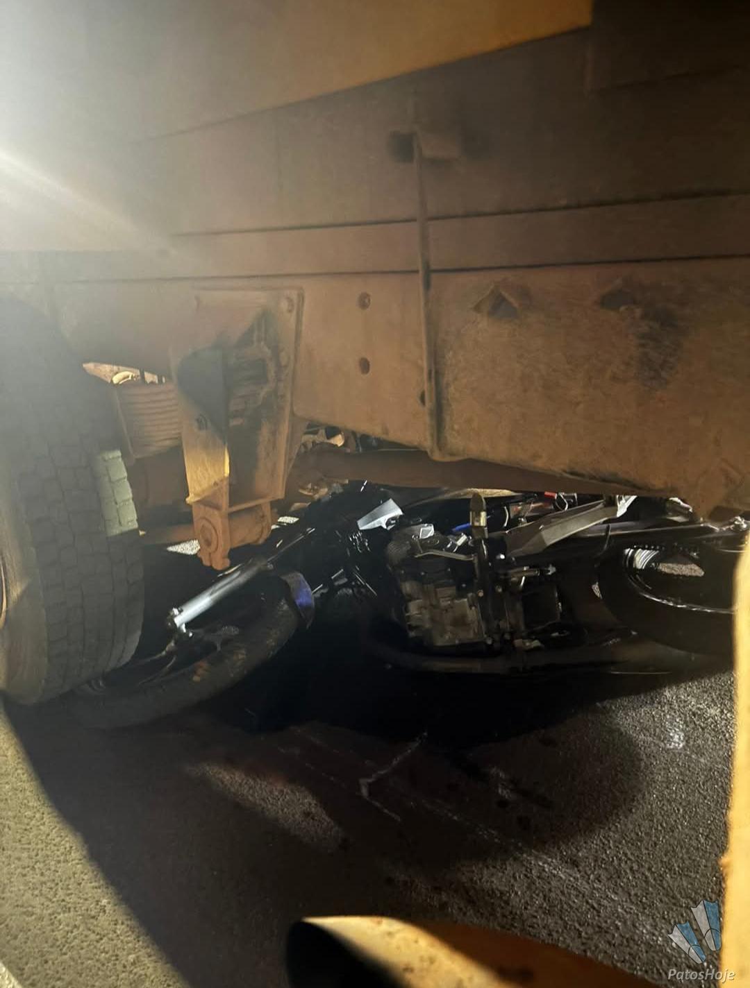 Um motociclista de 19 anos ficou gravemente ferido após se envolver em um acidente com um caminhão na noite dessa sexta-feira (01). A moto foi parar debaixo das rodas. O motorista do caminhão nao possui habilitação para esse tipo de veículo.