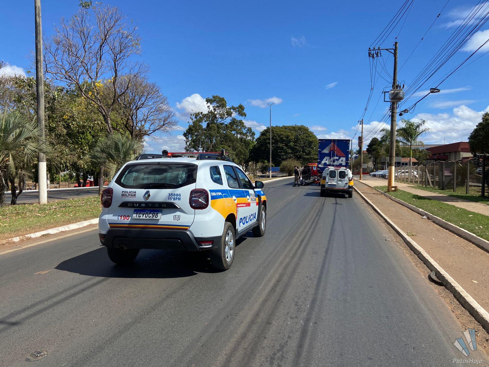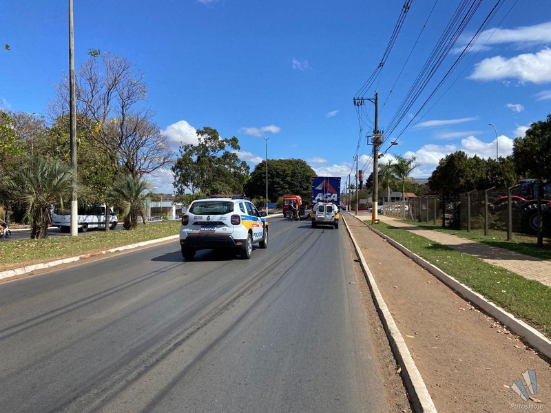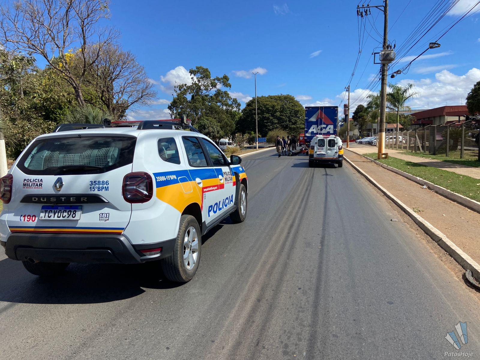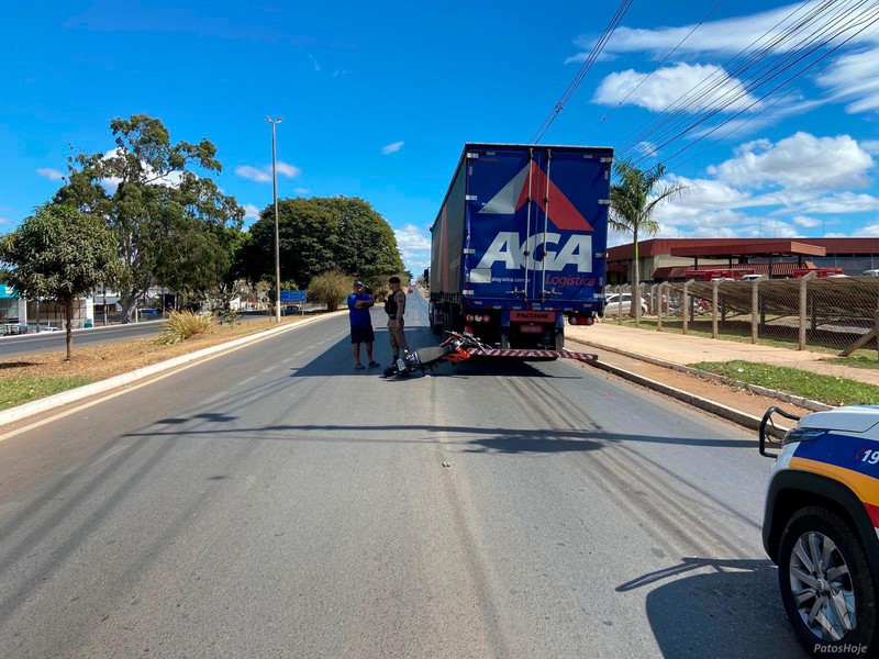 Mais um acidente de trânsito na avenida JK, em Patos de Minas. Desta vez, a batida foi entre uma motocicleta e uma carreta, na manhã desta quarta-feira (03). Testemunhas informaram que o capacete saiu da cabeça do motociclista, de 33 anos, antes dele bater com a cabeça. Ele precisou ser levado para o Hospital Regional Antônio Dias, em Patos de Minas.