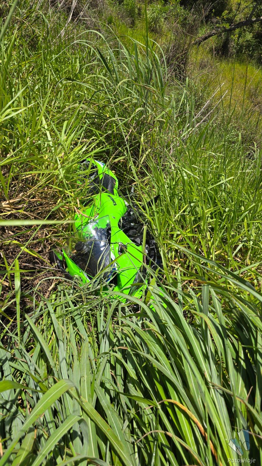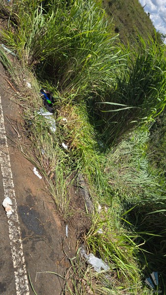 Após a batida, o homem ficou caído na rodovia. Já a moto foi arremessada em uma ribanceira.