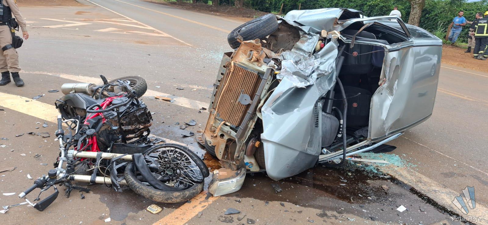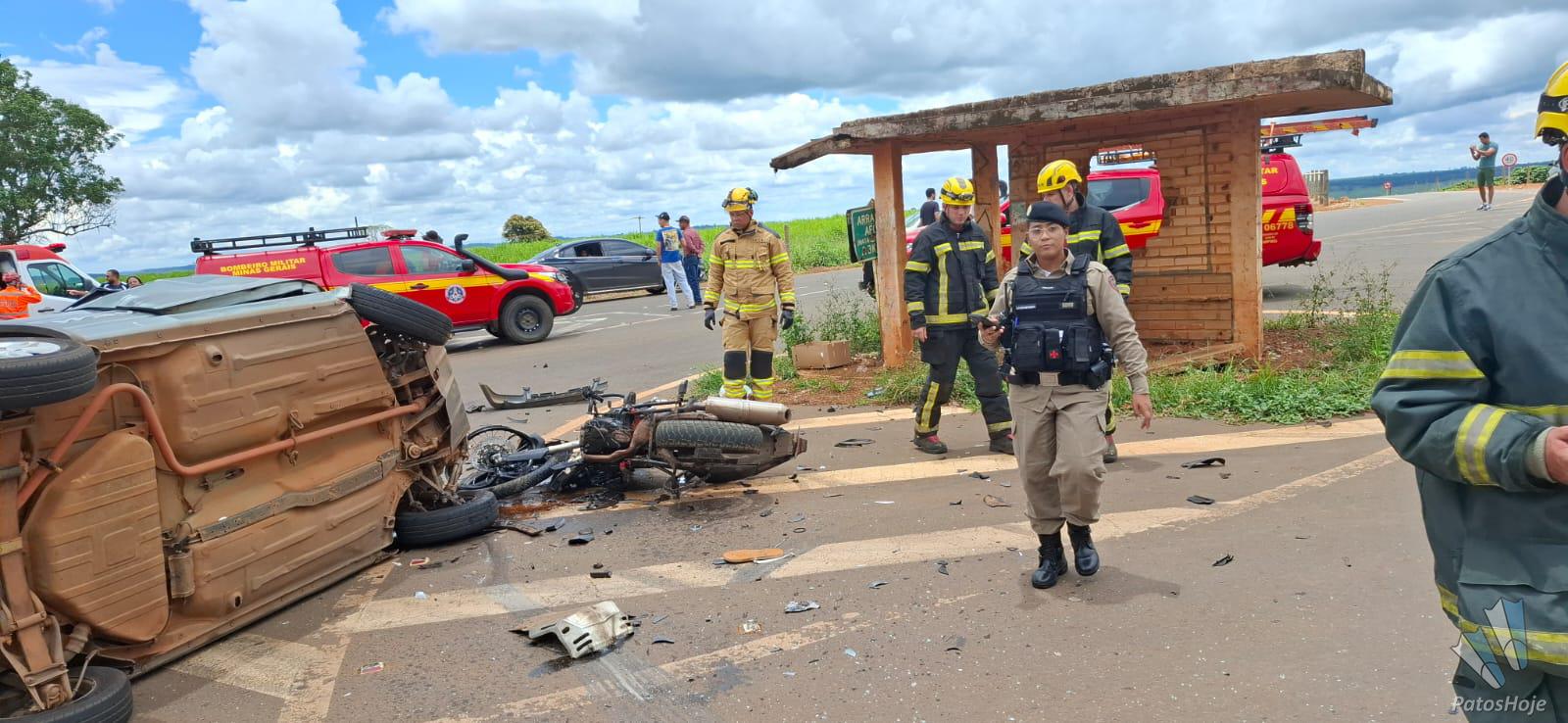 A Polícia Militar foi até o local para registrar a ocorrência. O carro parou tombado na via, bastante danificado. E a moto ficou completamente danificada.