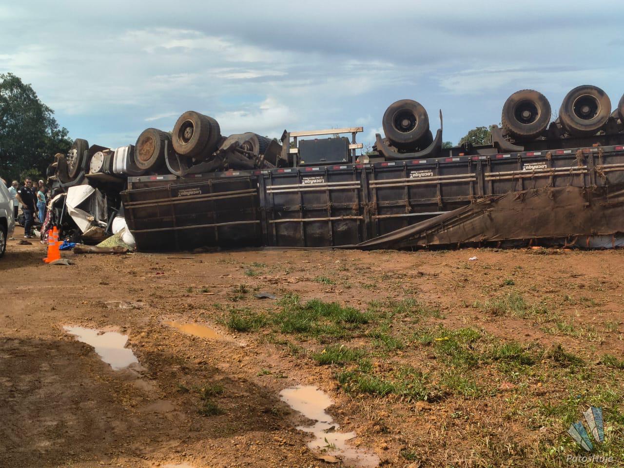 O condutor de uma carreta carregada com adubo morreu após o veículo capotar na BR365, próximo a comunidade rural Café Patense, em Patos de Minas. O acidente teria acontecido após um pneu estourar.