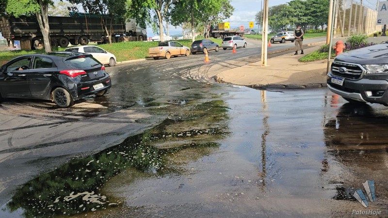 A Polícia Militar isolou o trânsito na pista lateral da avenida JK. A carreta espalhou óleo diesel por toda a extensão do quarteirão e deixou o local bastante escorregadio.