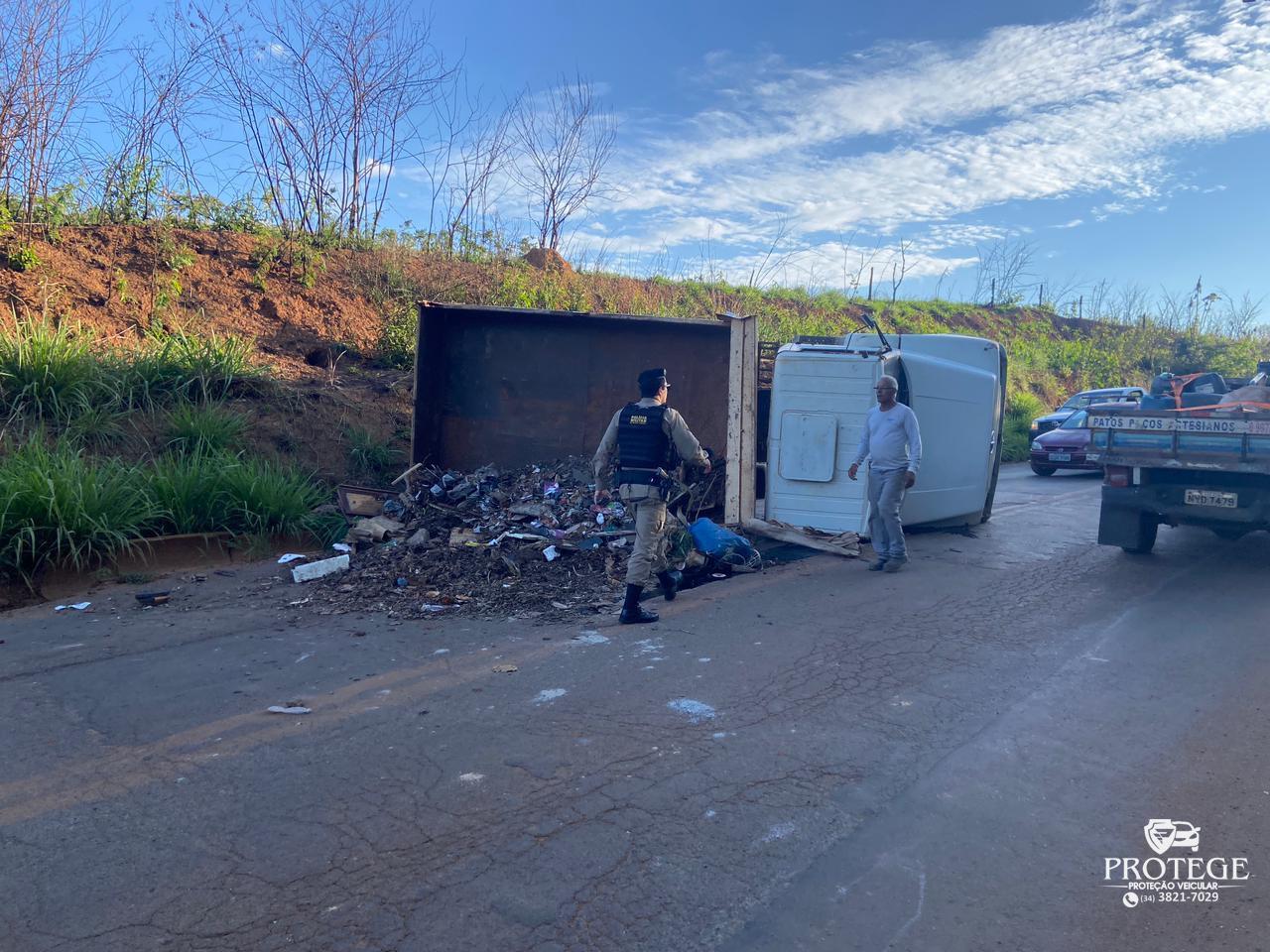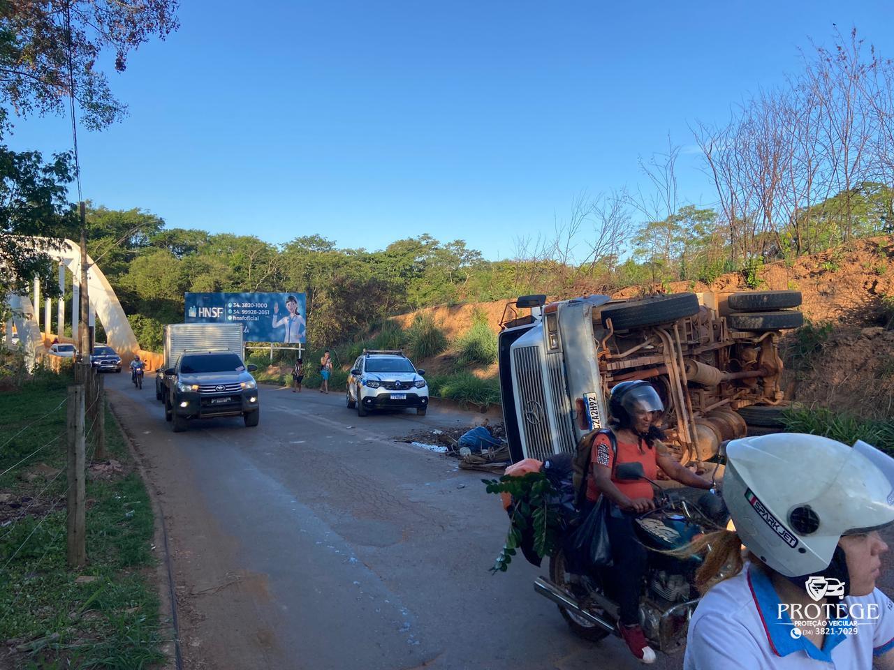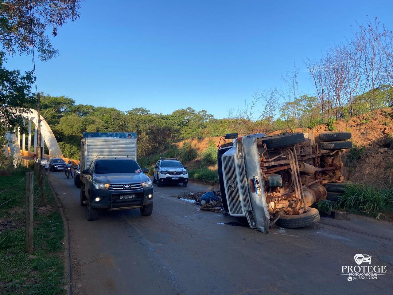 Um caminhão carregado com entulhos tombou nas imediações da chamada Ponte do Arco, sobre o Rio Paranaíba, nos fundos do bairro Nossa Senhora Aparecida, em Patos de Minas. O motorista, de 63 anos, ficou ferido e precisou ser socorrido pelo SAMU. O acidente deixou o trânsito lento nos dois sentidos. A suspeita é que o motorista tenha passado mal.