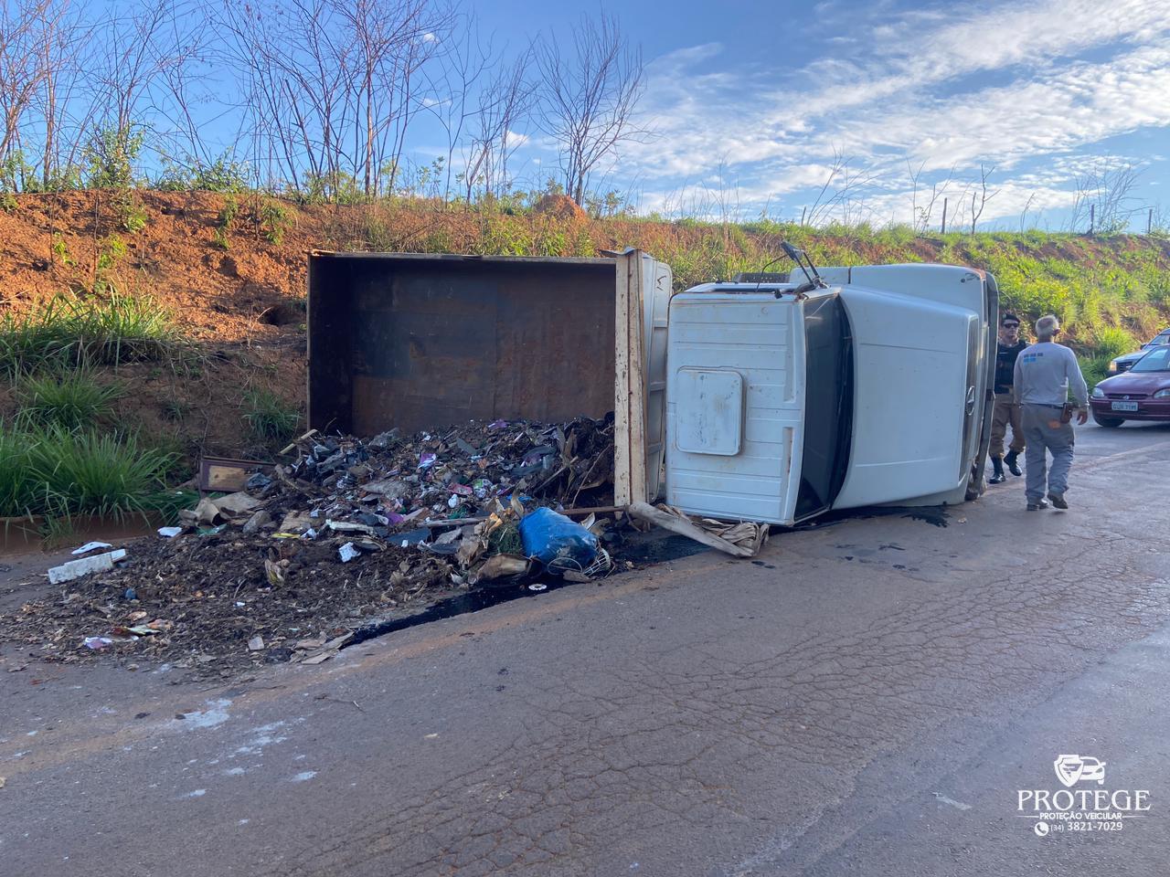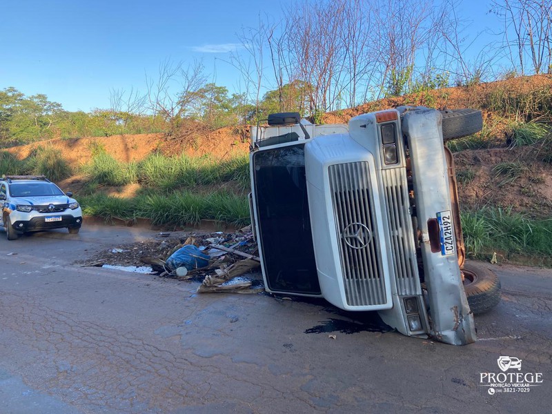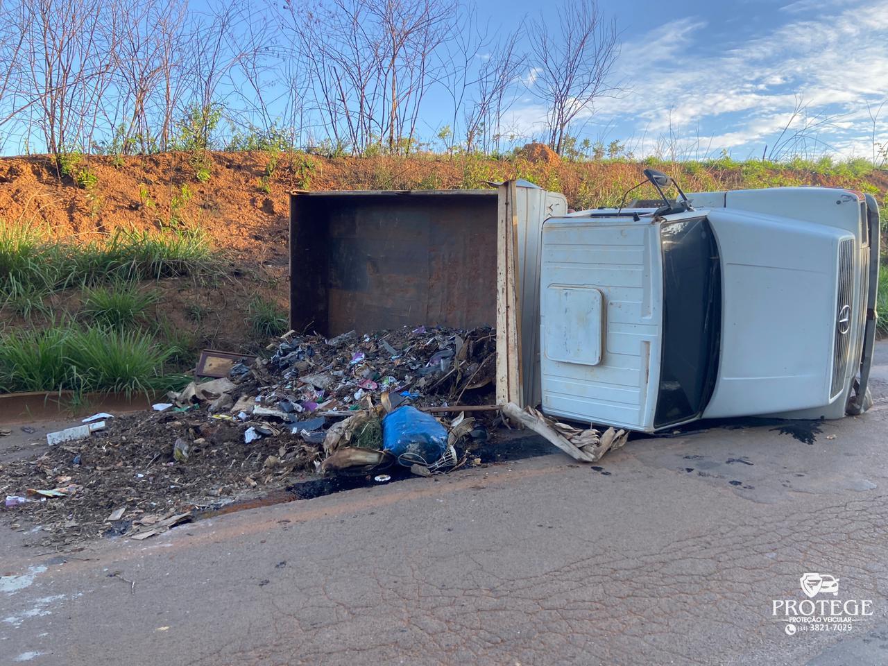 Um caminhão carregado com entulhos tombou nas imediações da chamada Ponte do Arco, sobre o Rio Paranaíba, nos fundos do bairro Nossa Senhora Aparecida, em Patos de Minas. O motorista, de 63 anos, ficou ferido e precisou ser socorrido pelo SAMU. O acidente deixou o trânsito lento nos dois sentidos. A suspeita é que o motorista tenha passado mal.