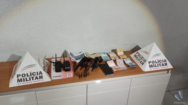 Na frente da residência dos suspeitos, onde os veículos estavam estacionados, os militares também apreenderam duas armas de fogo calibre .38, ambas municiadas e sem registro, sendo que uma delas estava com a numeração raspada. Dentro da casa, foram localizados ainda dois rádios comunicadores e, com um dos presos, a quantia de R$ 3.426,00 em dinheiro.