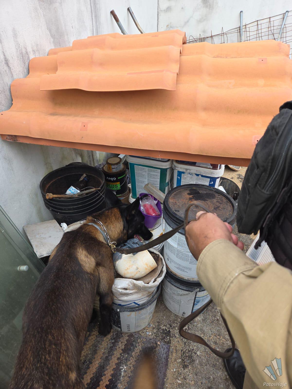 Com o auxílio de cães farejadores do GPCães, os policiais realizaram uma varredura no quintal da casa, onde encontraram, escondidos entre materiais de construção, diversos entorpecentes. No total, foram apreendidos 25 papelotes de cocaína, uma porção de "escama" (cocaína de alta pureza), um tablete de maconha, além de sementes da planta, balança de precisão e centenas de cápsulas vazias utilizadas para o fracionamento das drogas.