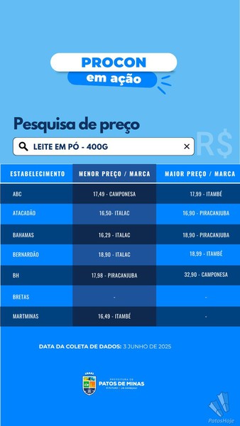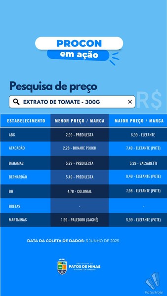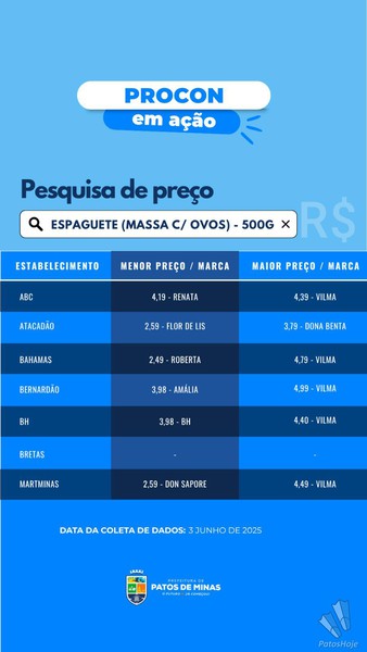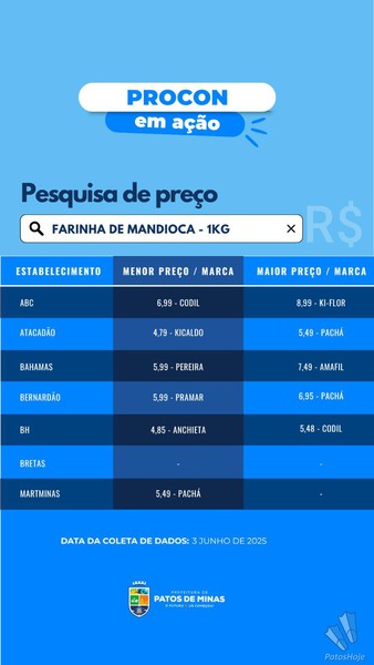 Os consumidores que forem aos principais supermercados de Patos de Minas nesta semana vão encontrar grandes variações nos preços de itens da cesta básica. Pelo menos é o que aponta uma pesquisa divulgada pelo Procon no final da tarde desta terça-feira (03).
