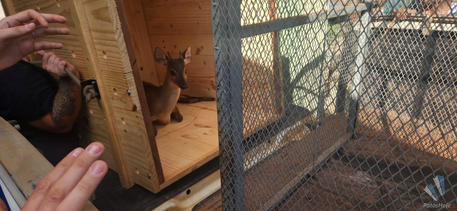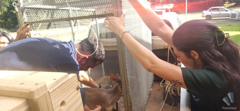 Os policiais informaram que, no local, foi constatado se tratar de um animal silvestre da espécie Veado Catingueiro, que aparentemente estava com dificuldades para andar e arrastava as patas traseiras. Diante disso, foi realizada a captura do animal silvestre que posteriormente foi entregue no CETRAS- Centro de Triagem e Reabilitação de Animais Silvestres- de Patos de Minas/MG para os devidos cuidados.