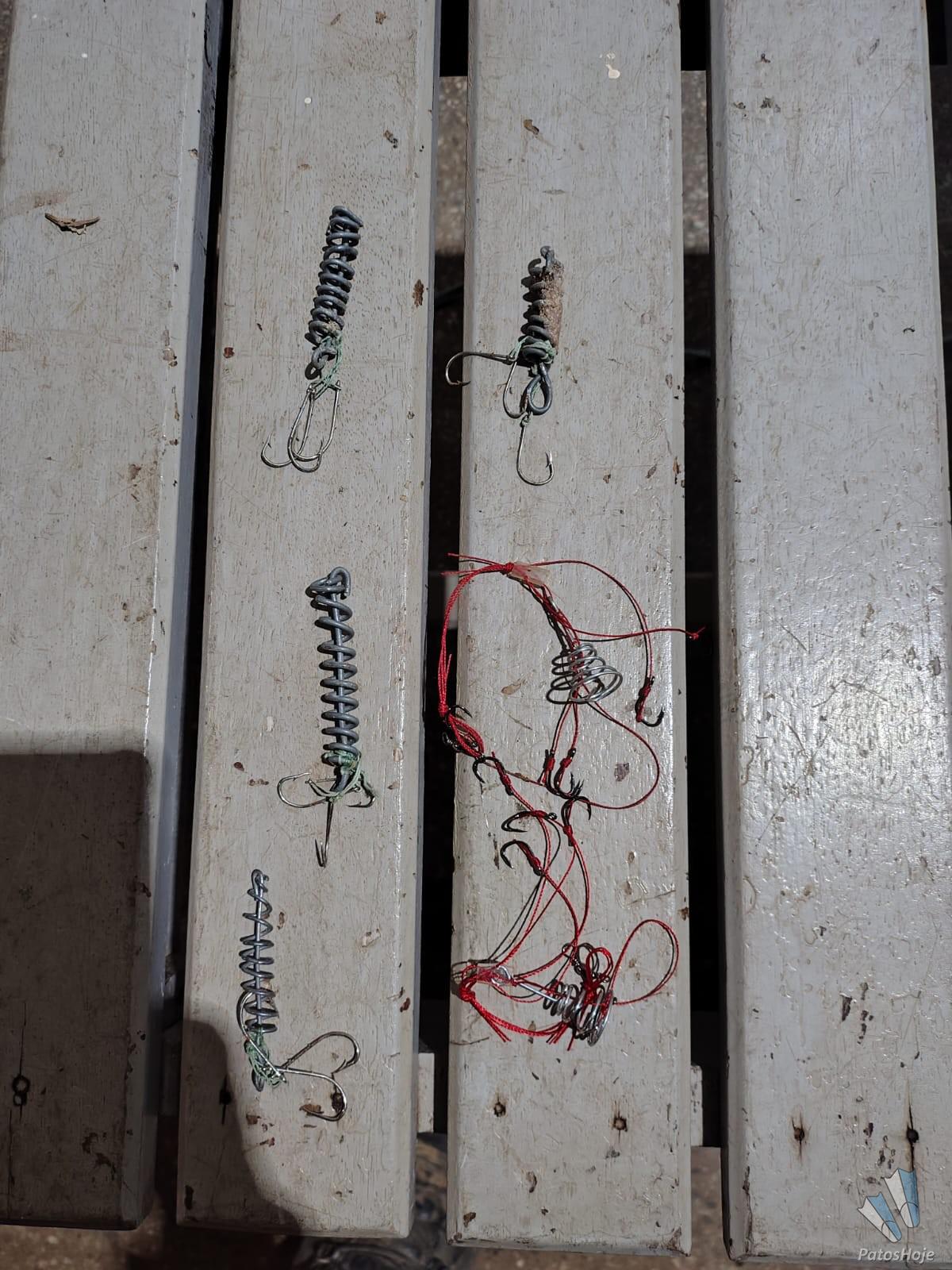 Foram encontrados no imóvel os seguintes materiais, 1 rifle cal. 22, 18 cartuchos cal. 32 deflagrados, 2 cartuchos cal. 32 intactos, 2 frascos contendo espoletas, material de recarga de cartucho, 6 chuveirinhos, 2 tarrafas de medida proibida para a categoria, 1 carcaça de jacaré e 1 estilingue.