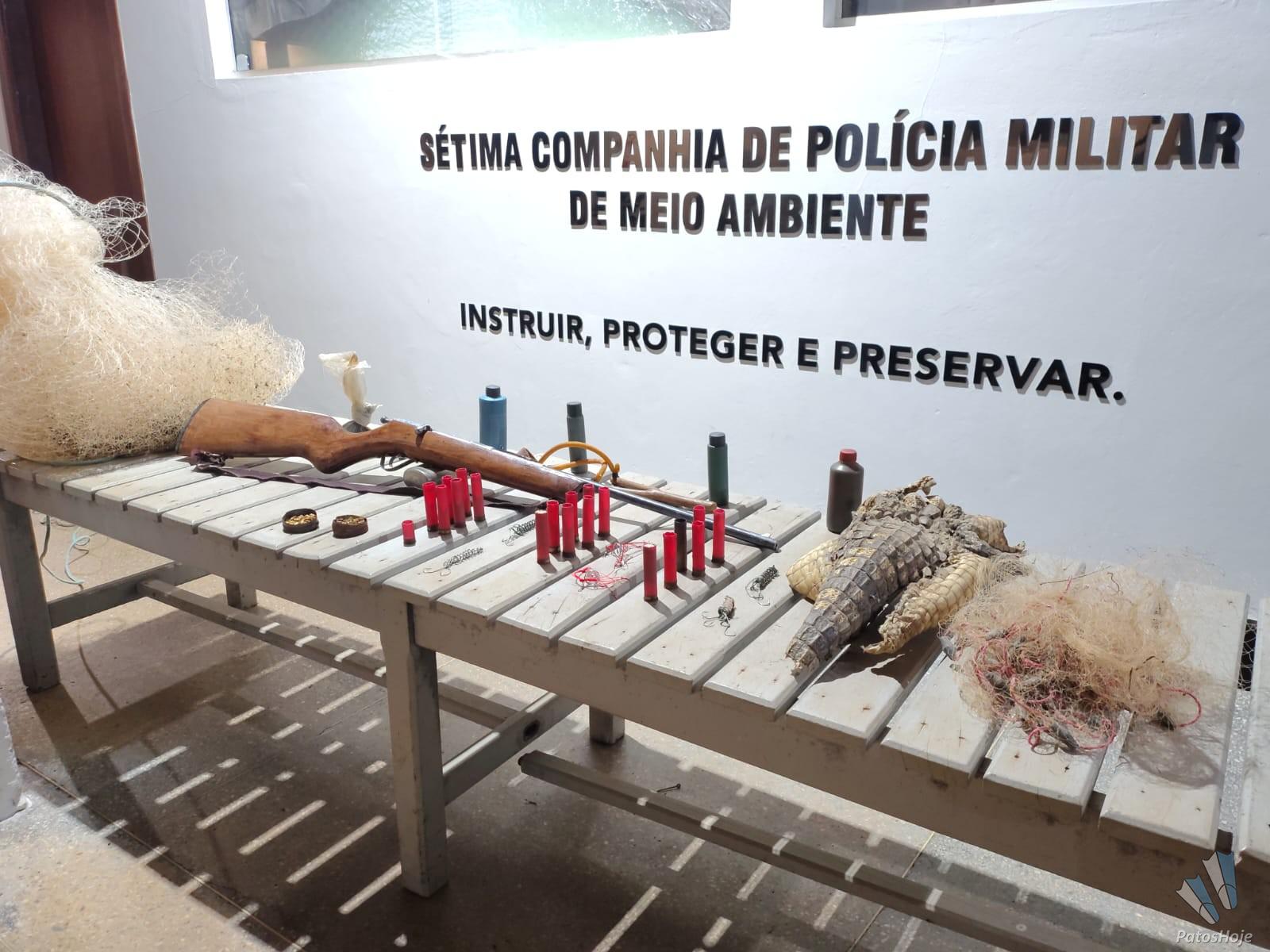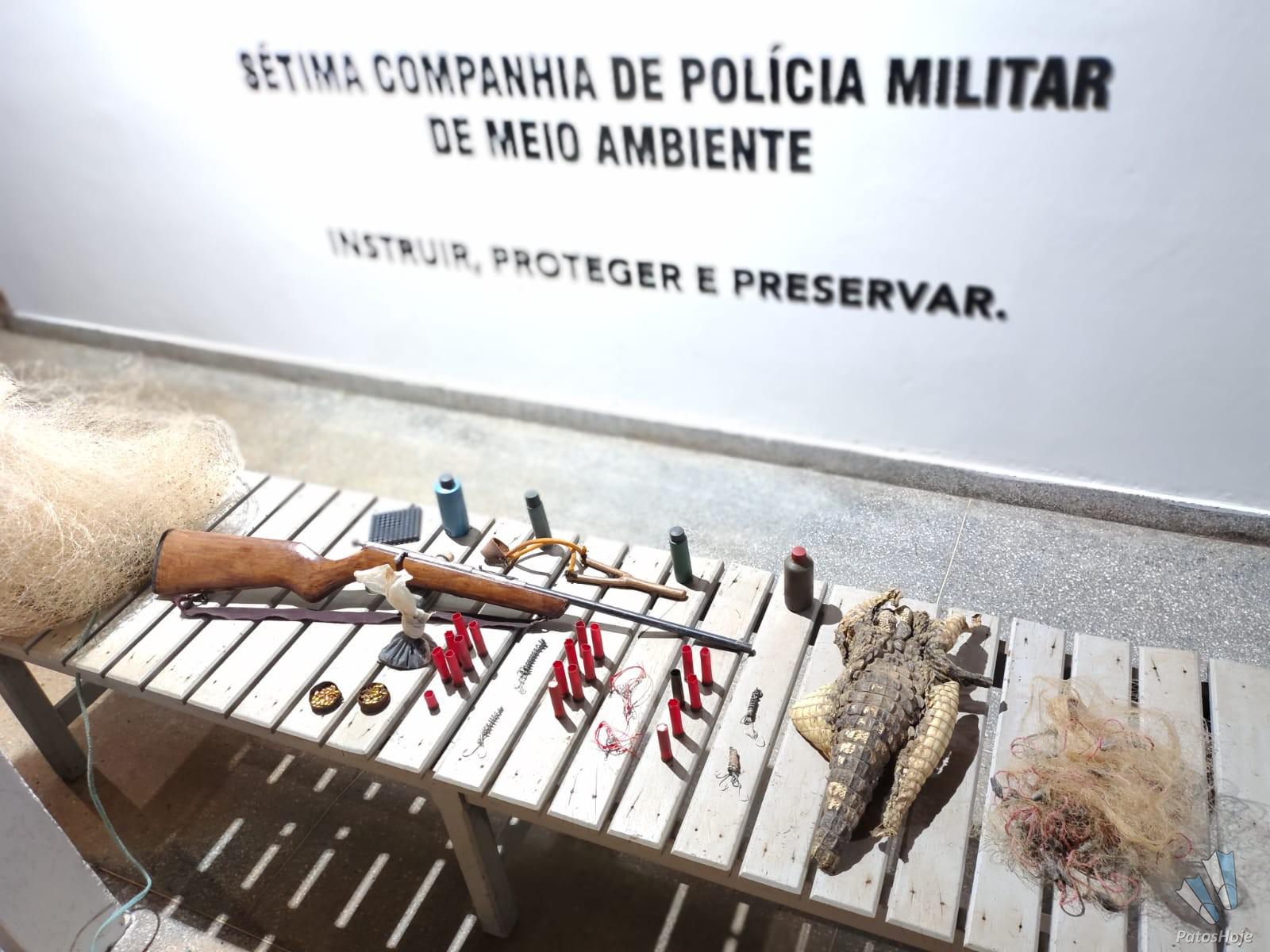 A Polícia Militar de Meio Ambiente prendeu um homem nessa quarta-feira (20) por caça e pesca predatória na região do Barreiro, em Lagoa Grande. A prisão aconteceu após uma denúncia anônima. Os policiais encontraram arma, munições e até a carcaça de um jacaré, animal silvestre proibido de ser caçado.