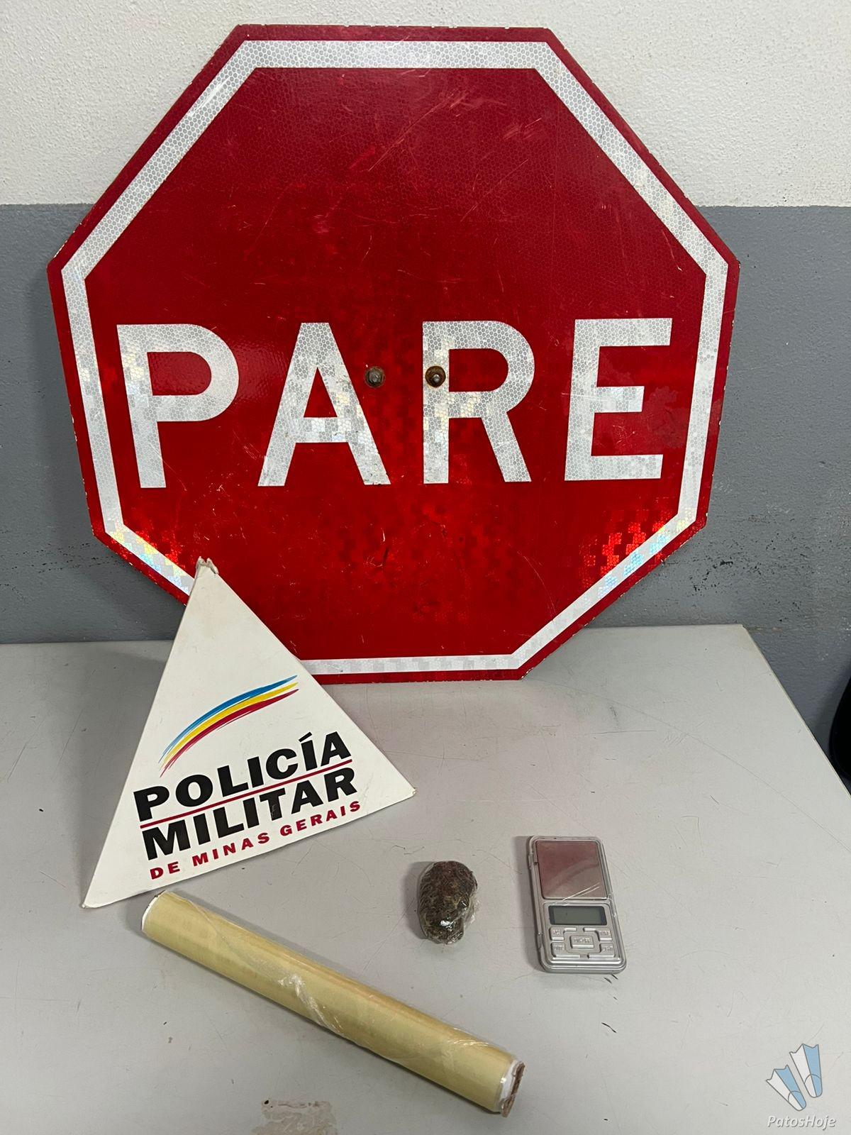Uma ocorrência de tráfico de drogas, neste domingo (27), no bairro Residencial Monjolo, em Patos de Minas, levou os polícias a encontrarem algo inusitado na parede do suspeito: uma placa de “Parada Obrigatória”. O morador não soube esclarecer a origem do objeto. Os militares ainda apreenderam uma bucha de maconha, plástico “insulfilm” e uma balança de precisão.