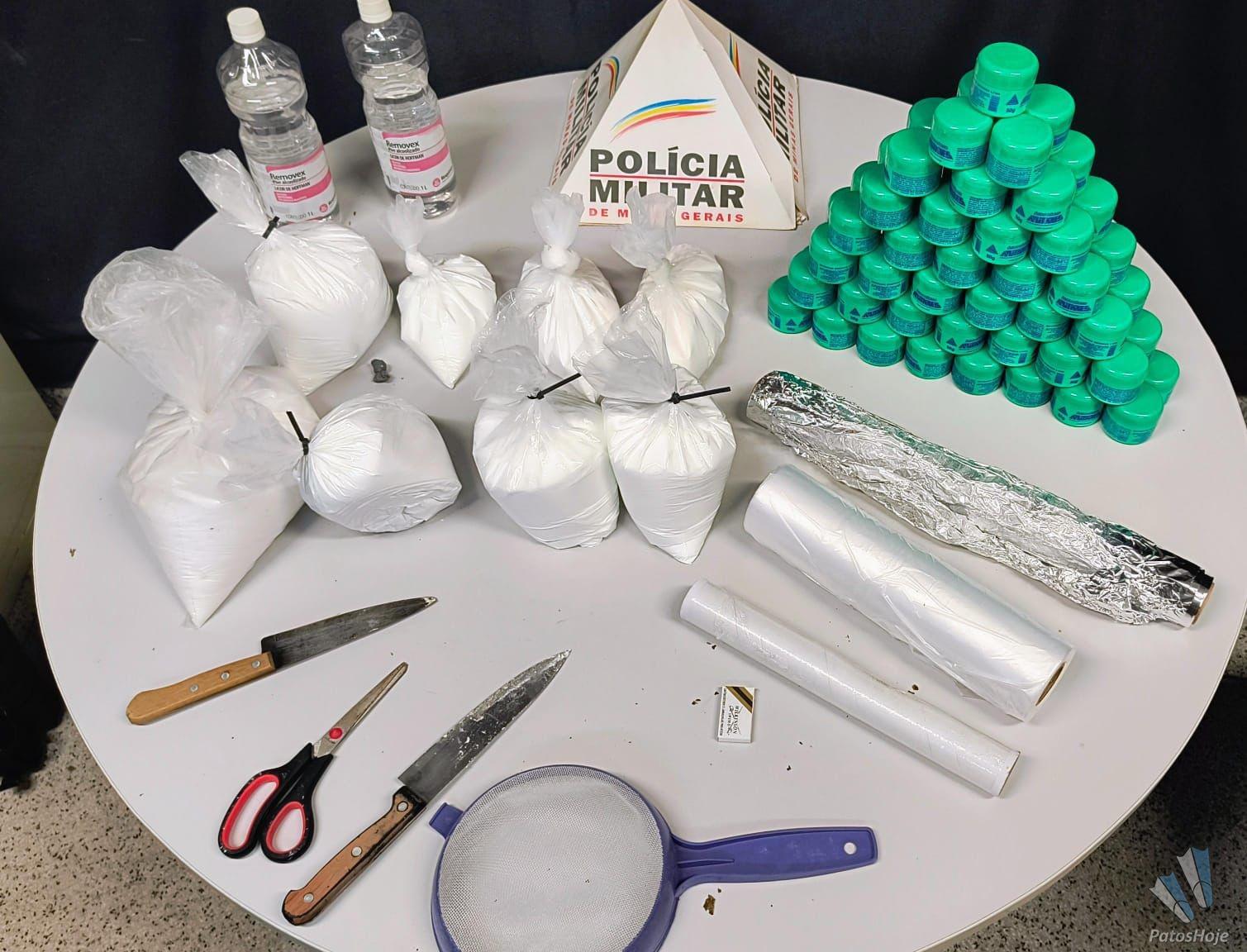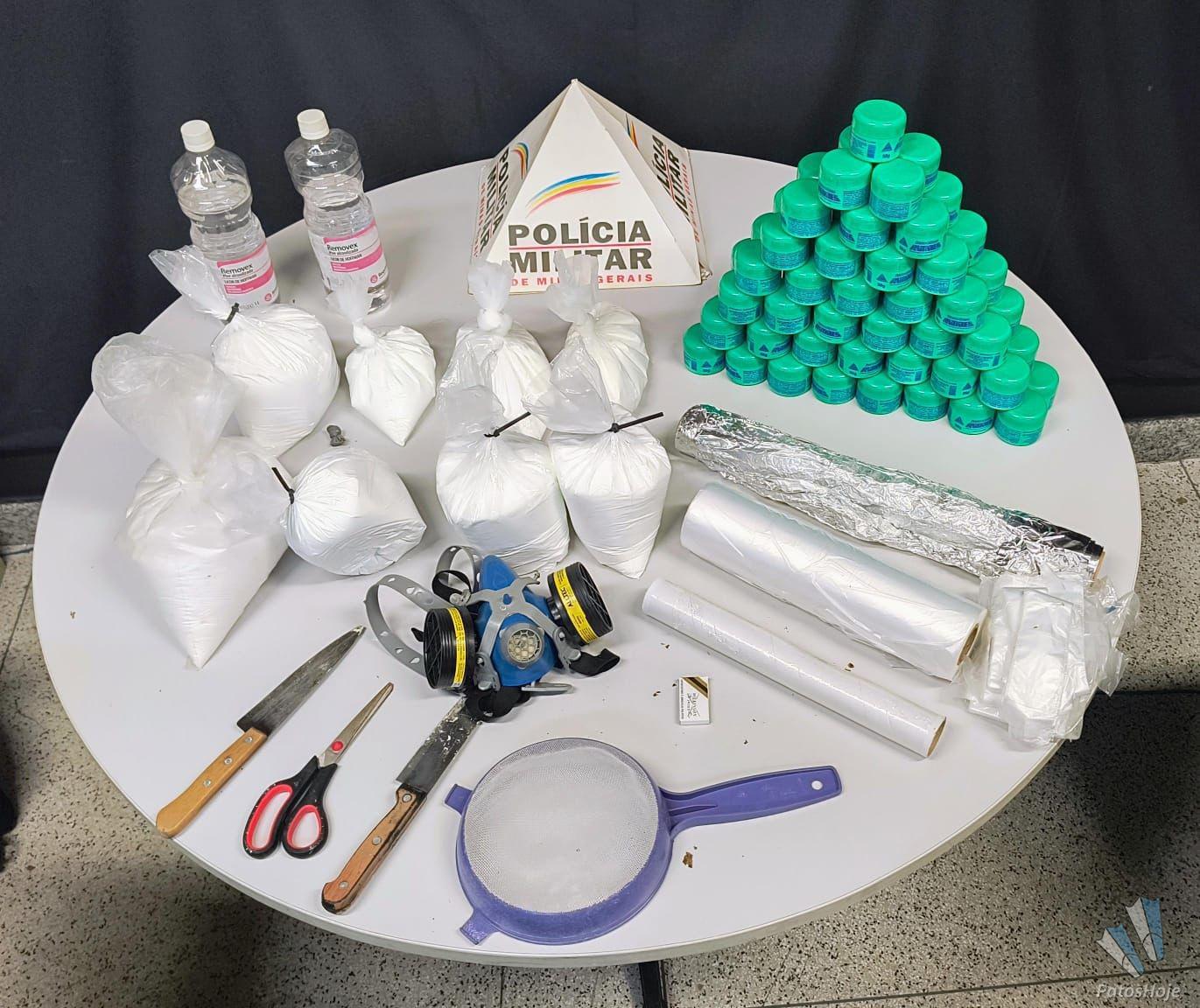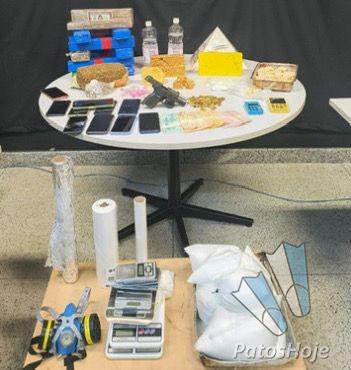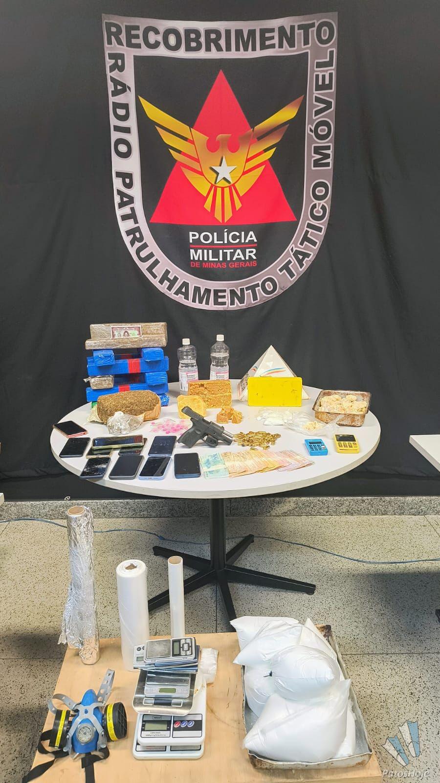 Durante as diligências foram localizados os seguintes materiais que foram apreendidos: 105 porções de pasta base em pedra, Porção de pasta base em farelo, 14 porções de cocaína, 01 porção grande de cocaína, 01 barra grande de cocaína, 01 barra grande de crack, Meia barra de crack, 11 pedras grandes de crack, 10 barras grandes de maconha, 16 tabletes grandes de maconha, 31 comprimidos de ecstasy, 01 pistola calibre 9mm (produto de furto na cidade de Perdizes/MG), diversas munições calibres 9mm e .40, Vários aparelhos celulares, 02 veículos, diversos materiais para refino e dolagem (éteres, formas de aço, sacos, facas, tesoura), 75 frascos e sacos contendo ácido bórico, diversas balanças de precisão e uma quantia em dinheiro não especificada.