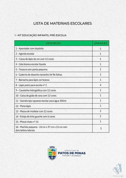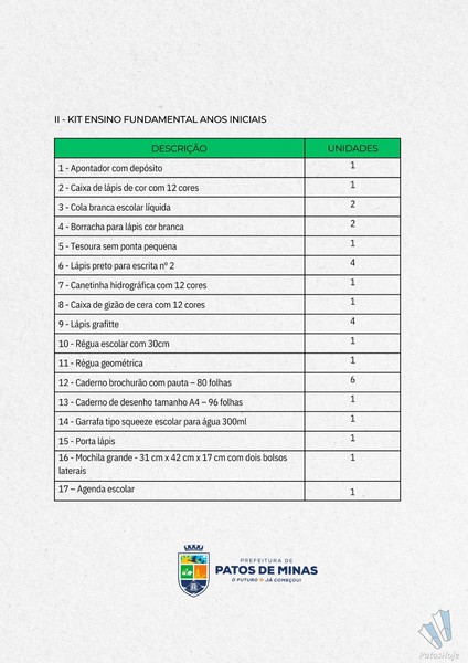 A Prefeitura de Patos de Minas entregará novamente, neste ano, kits escolares para alunos da rede municipal de ensino, matriculados na pré-escola e no ensino fundamental. Os materiais já estão no município e a Secretaria Municipal de Educação (Semed) se organiza para iniciar a entrega às unidades de ensino na primeira quinzena de fevereiro. Além disso, todos os estudantes da rede municipal ganharão uniformes.