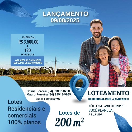 O sonho de conquistar um lote próprio com excelente localização, infraestrutura completa e alto potencial de valorização está prestes a se tornar realidade em Lagoa Formosa. No próximo dia 09 de agosto, será lançado oficialmente o Loteamento Residencial Rocha Andrade II, um novo bairro planejado que chega para atender às necessidades de quem busca investir com segurança ou construir a casa própria com conforto e praticidade.