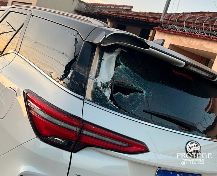 As caçambas de caminhões basculantes são feitas de aço para suportar cargas pesadas. Em caso de acidentes, o estrago pode ser grande. Em Lagoa Formosa, a tampa da caçamba atingiu a traseira de uma Toyota SW4, que estava estacionada. Por sorte, não havia ninguém por perto.