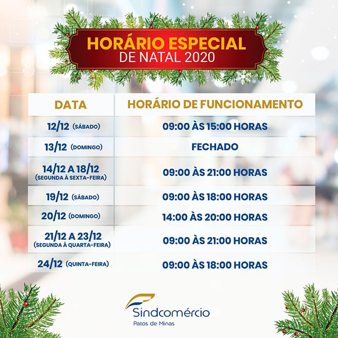 O comércio de Patos de Minas terá horário especial de funcionamento durante no mês de dezembro. O Sindicato do Comércio Varejista – SindComércio – divulgou os dias e horários de funcionamento das lojas do comércio de rua para as compras de Natal. O horário especial começa no dia 12 de dezembro.