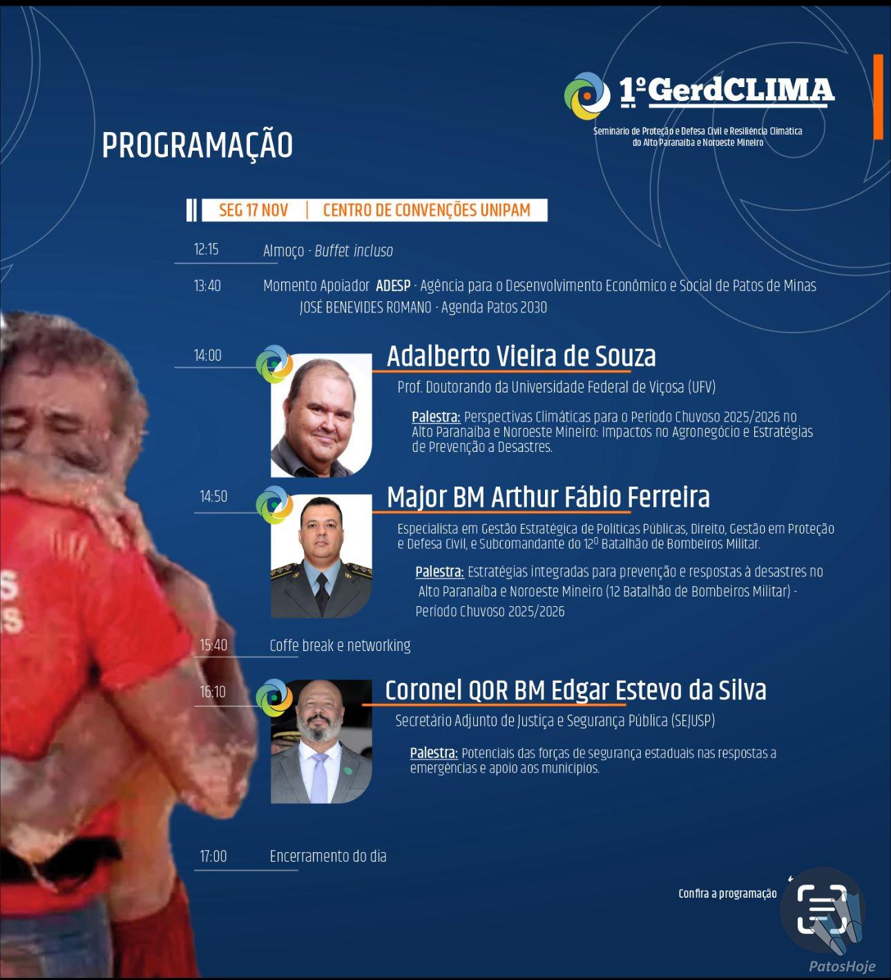 À tarde, o seminário traz painéis com Sidnei Furtado Fernandes, do Centro de Resiliência de Campinas (MCR2030/UNDRR); Adalberto Vieira de Souza, da Universidade Federal de Viçosa (UFV); e o Major BM Arthur Fábio Ferreira, especialista em políticas públicas e Subcomandante do 12º BBM , que discutirão as tendências climáticas, estratégias preventivas e de resposta a região do alto paranaíba e noroeste mineiro para o período chuvoso que se aproxima assim como uma reflexão sobre a importância da adesão aos municípios na Iniciativa da ONU MCR 2030.