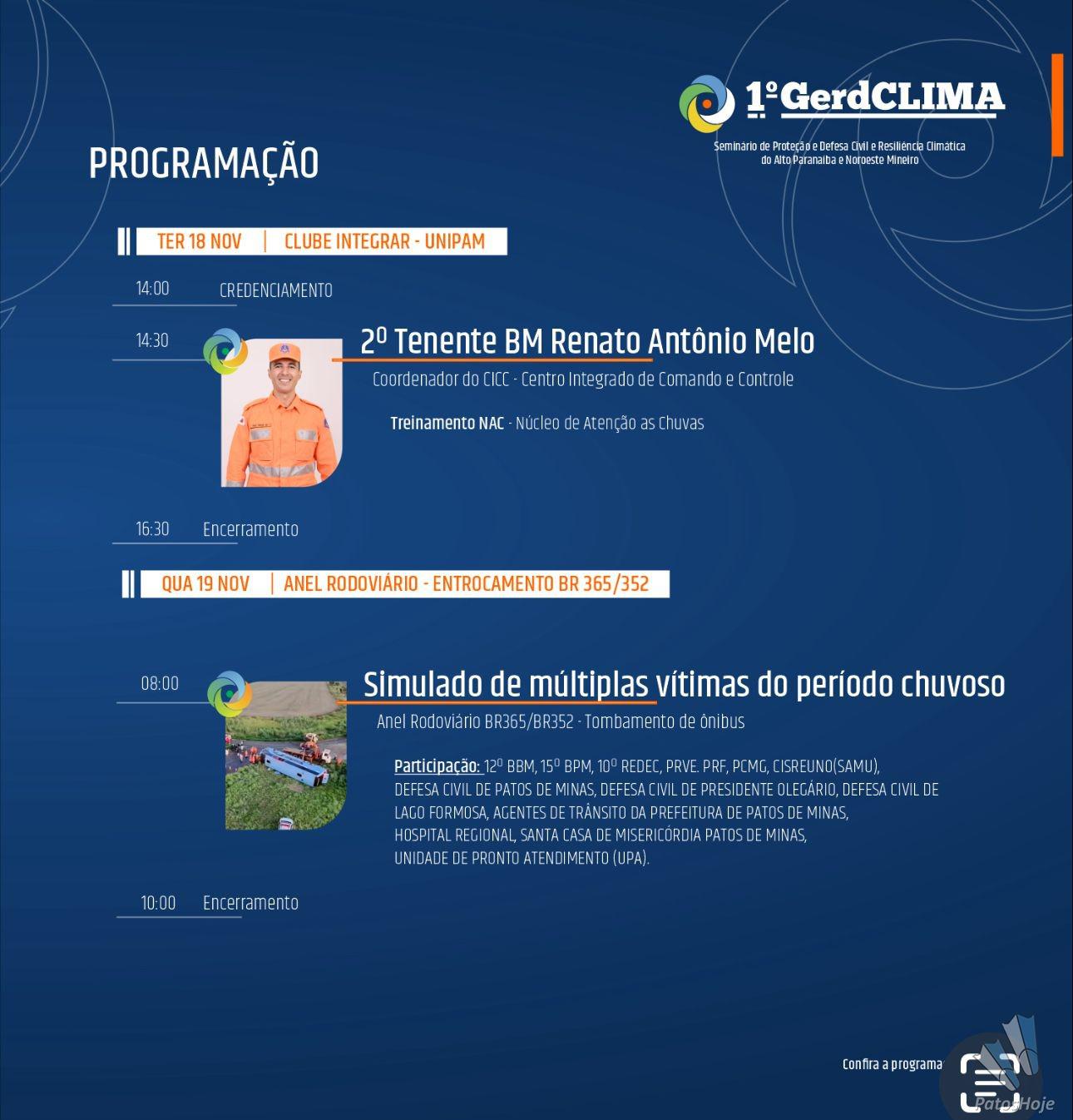 A abertura ocorre no dia 17 de novembro, a partir das 7h30, com presença de autoridades como o Prefeito de Patos de Minas e Presidente da AMM, Luís Eduardo Falcão Ferreira; o Secretário-Adjunto de Justiça e Segurança Pública, Coronel QOR BM Edgar Estevo da Silva; autoridades da CEDEC/MG e o Dr. Paulo Sérgio Mendes César, doutor em ciências políticas e administração pública.