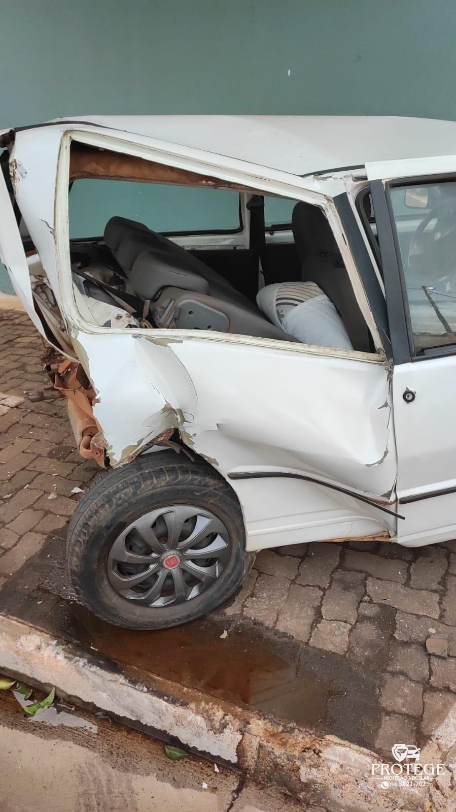 As imagens da câmera de segurança flagraram o momento da batida e o motorista em fuga pela rua Vereador João Pacheco. O impacto foi tão forte que arremessou o Fiat Uno para cima da calçada. O veículo ficou a parte traseira destruída. Por sorte, não havia ninguém no local e não houve feridos.