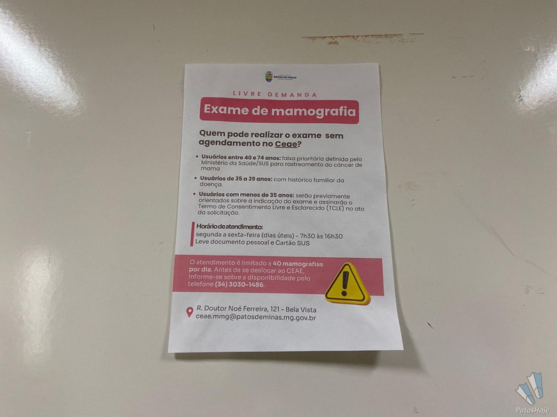 Nunca foi tão fácil realizar uma mamografia em Patos de Minas. Desde o final de agosto, Mulheres, e também homens, não precisam mais agendar o exame nem apresentar pedido médico. A mamografia é feita por livre demanda, direto no Centro Estadual de Atenção Especializada (CEAE), no Bairro Bela Vista, de segunda a sexta-feira, das 7h às 17h.