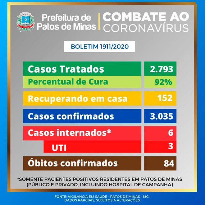 De acordo com o boletim municipal, a Capital do Milho tem agora 3035 casos confirmados da doença, ontem eram 3018. Desse total, 6 estão internados, sendo 3 em leitos de UTI, 152 estão se recuperando em casa e 2793 já se recuperaram, um percentual de 92,0%.