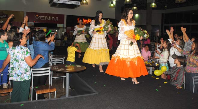 As três candidatas que disputam o título de Rainha Nacional do Milho 2015, fizeram a primeira apresentação em público e com trajes típicos. O desfile aconteceu na noite dessa terça-feira (19) na Praça de Alimentação do Pátio Central Shopping. Muita gente acompanhou a apresentação, incluindo, é claro, as torcidas das três candidatas.