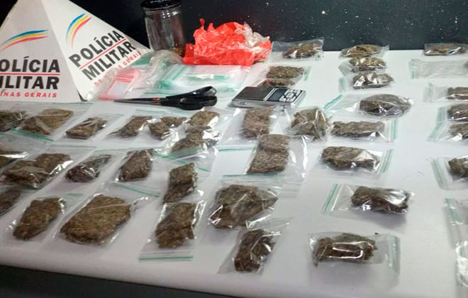 No quarto dos infratores, sobre a cama do casal, foi localizada uma caixa de papelão contendo 45 invólucros plásticos transparentes contendo em seu interior 45 tabletes de maconha; 16 embalagens plásticas menores contendo porções fracionadas da droga; 3 pacotes de embalagens plásticas (plásticos zíperes) e 01 tesoura.